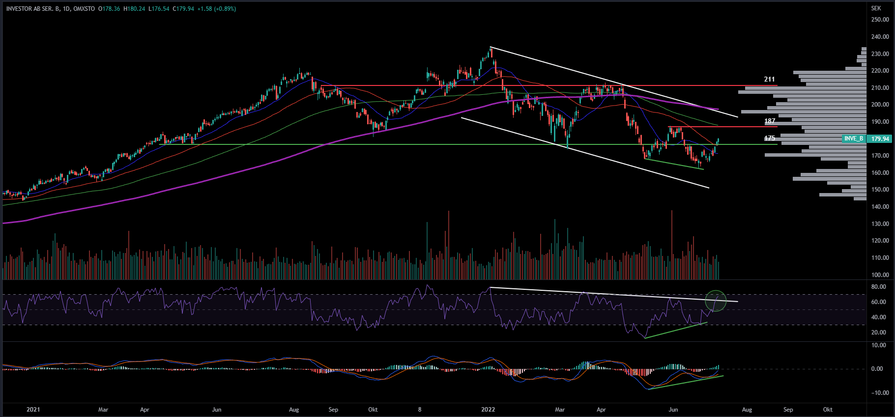 Investor har en teknisk bild som påminner mycket om de två aktierna som presenterats ovan. Återigen kan en fallande trendkanal åskådliggöras, en sådan som formats efter att aktien handlats i en stigande trendkanal under större delen av perioden 2020-2021. Det har förmodligen ackumulerats stora vinster och när det blir blåsigt på börsen finns det risk att många aktieägare som varit med på en fin resa väljer att ta hem lite vinst. Detta är något som bidrar till ökad pessimism och kortsiktiga marknadsaktörer kan börja agera på kortsidan med attraktivare Risk-Reward. En grundläggande idé är att det nästan alltid är enklare att handla i trendens riktning, nu befinner sig Investor i en fallande trend och så länge handelsmönstret inte ändras kommer det finnas ett incitament att gå kort.