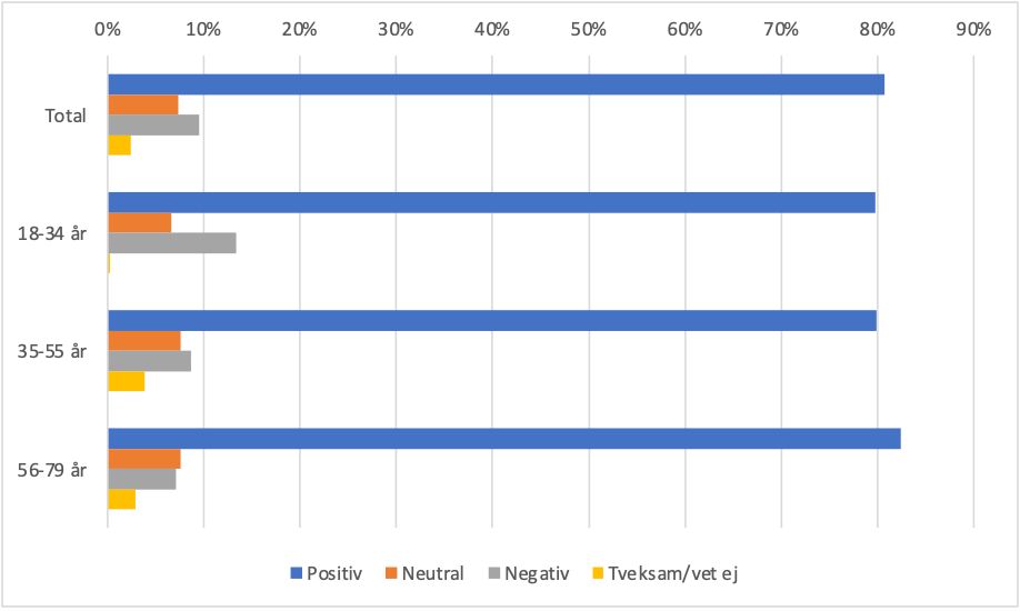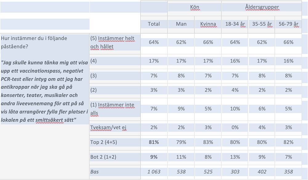 Den positiva inställningen till covidpass finns i alla åldersgrupper samt bland både män och kvinnor. Det finns således en stor villighet hos både publik och arrangörer att införa covidpass, för att på så sätt kunna öppna upp salonger och scener för ännu fler människor på ett smittsäkert sätt. Med krav på uppvisande av covidpass kan övriga restriktioner tas bort. Det skulle också göra att branschen slipper ställa in ännu fler föreställningar och arrangemang under hösten.