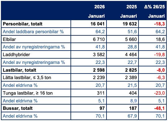 Andelen laddbara personbilar uppgick till 64 procent av nyregistreringarna. Elbilar stod för 42 procent, en tydlig ökning från 29 procent i januari i fjol. Laddhybriderna ligger kvar på 22 procent i andel, men minskade med 20 procent i volym.