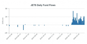 Under det senaste året, innan utbrottet av Coronaviruset såg denna fond nettoinflöden under en enda dag. Nu har de stigit med mer än 600 MUSD. Bland fondens innehav finns aktier i Southwest Airlines, American Airlines, Delta Air Lines och United Airlines. Dessa flygbolag utgör 11.4%, 11.0%, 9.4% och 9.1% av fondens förmögenhet.