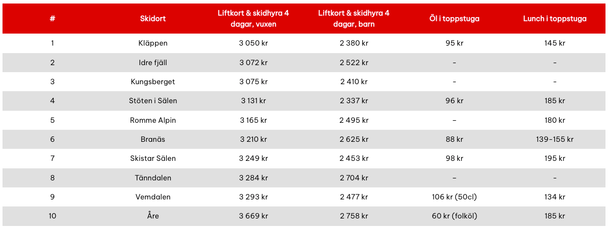 Undersökningen omfattar de tio största svenska skidorterna baserat på liftkortsomsättning enligt SLAO. Priserna hämtades i slutet av november 2025 och avser snittkostnad för fyra dagars skidåkning mellan den 26 december och 2 mars. Lunchpriser baseras på dagens rätt, gulaschsoppa eller ett snittpris på respektive toppstuga. Ölpriserna gäller standard starköl, med undantag för Åre där endast folköl säljs i toppstugan.