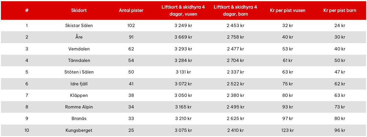 Att jämföra priserna ger en viktig bild, men Sambla har även analyserat hur mycket skidåkning man faktiskt får för pengarna. Genom att ställa kostnaden i relation till antalet pister får Skistar Sälen och Åre högst värde per krona.
