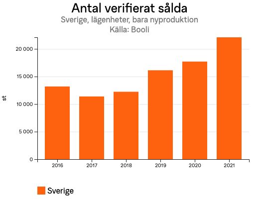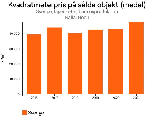 Under 2021 var det genomsnittliga priset för en såld, nyproducerad lägenhet 47 700 kronor per kvadratmeter. Det är en ökning med 11 procent mot 2020. Det är också den högsta prisnivån sedan Booli började mäta år 2008. I snitt var medelboarean för en såld lägenhet 70 kvadratmeter.