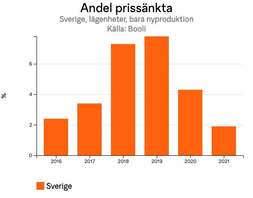 Statistiken visar även att det skedde rekordfå prissänkningar på nyproduktionsmarknaden under året. 1,9 procent av utbudet prissänktes, vilket går att jämföra med 4,3 pricent år 2020.