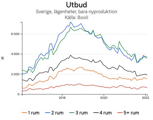 Statistiken är baserad på lägenhetsannonser för nyproduktion i Sverige som Booli har samlat in under perioden 2016-01-01 till 2021-12-31. Andrahandsbostäder är inte medräknade. Statistiken är hämtad från analysverktyget Booli Pro och primärt baserad på data från bostadsutvecklares hemsidor.