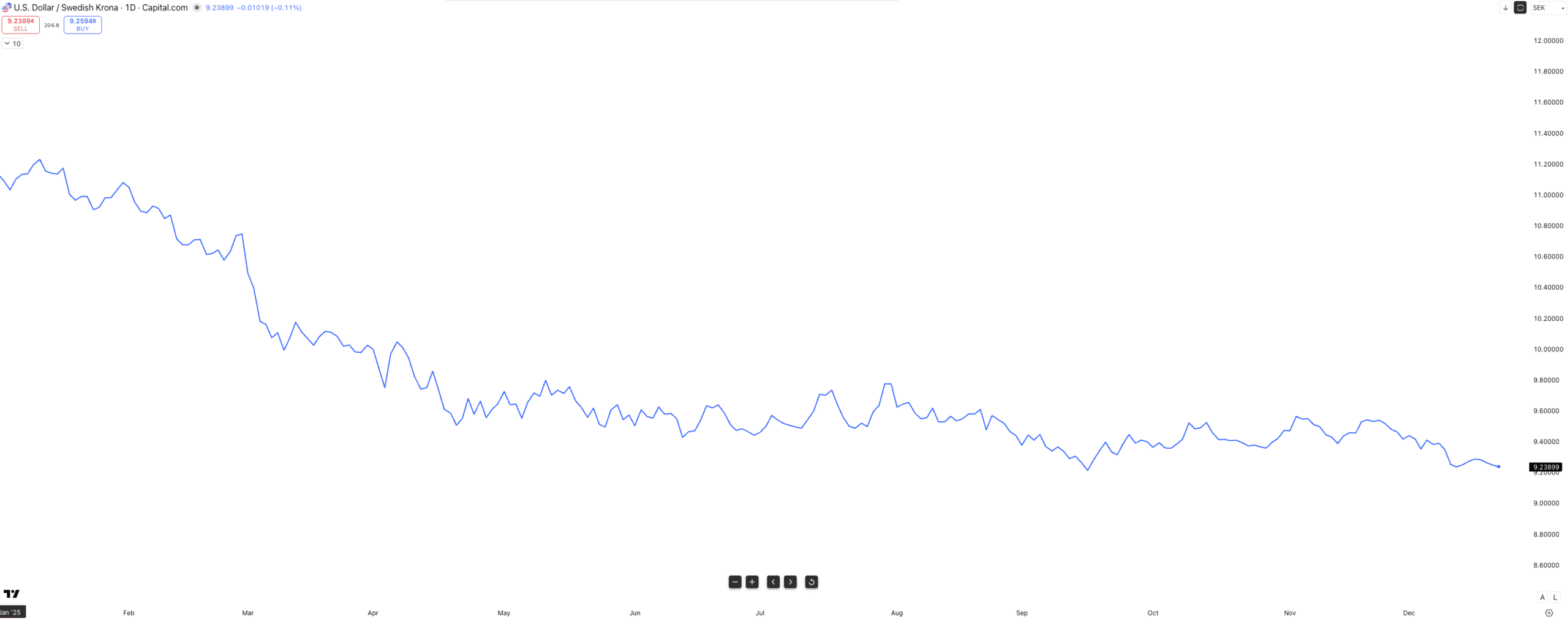 Året närmar sig sitt slut och 2025 kan sammanfattas som ett exceptionellt starkt år för kronan. Den svenska kronan har stärkts med omkring 16 procent mot dollarn och är därmed den starkaste valutan inom G10. Kronförstärkningen sticker ut även i ett historiskt perspektiv, årets uppgång mot dollarna är nämligen den största sedan 2003. Detta trots att 2025 präglats av betydande politisk osäkerhet globalt, inte minst i USA och kring tullfrågor, en miljö där kronan annars tenderar att försvagas mot dollarn.
