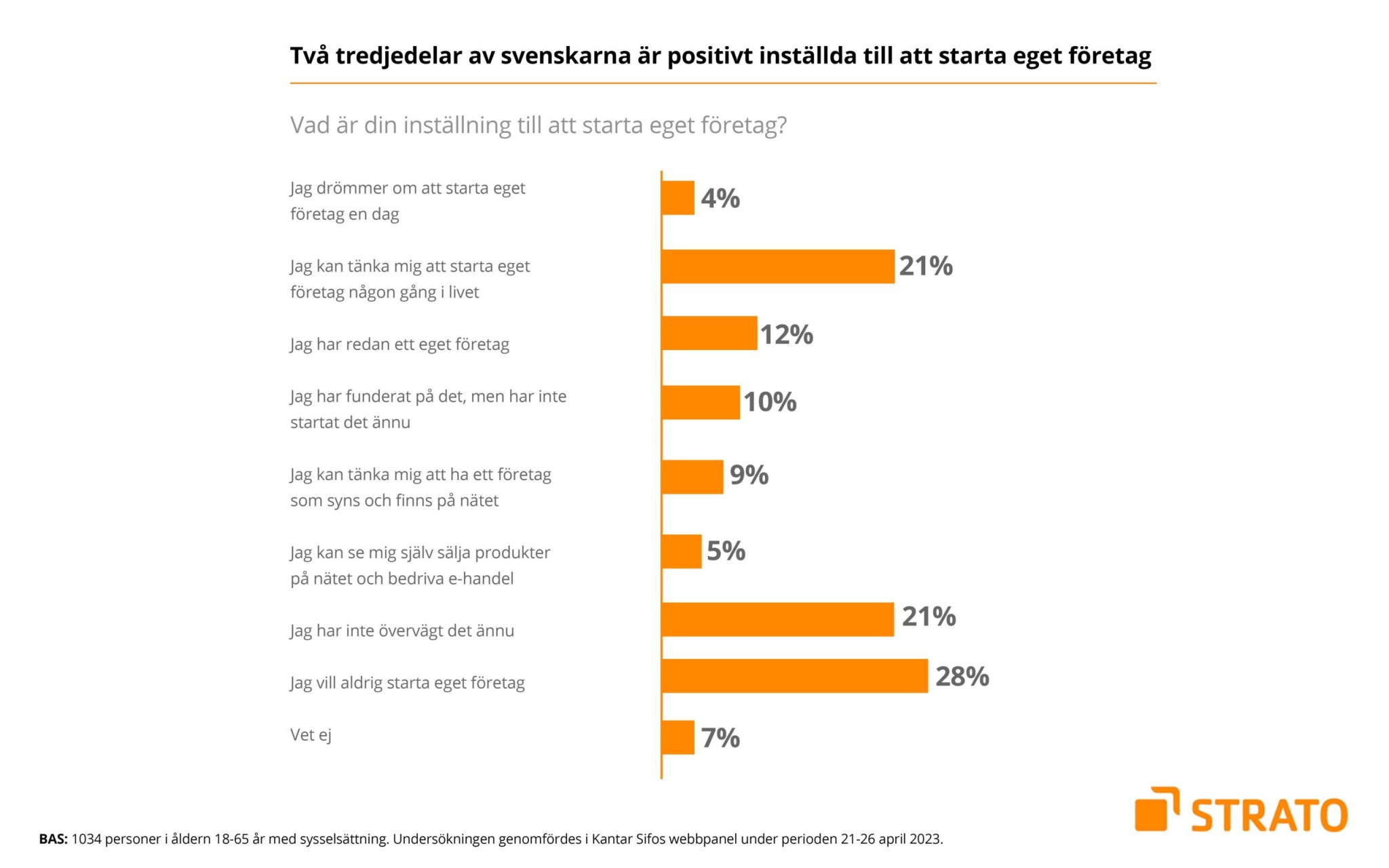 En majoritet av svenskarna visar en positiv inställning till att bli företagare. Enligt en ny undersökning från STRATO uppger totalt 65 procent av de tillfrågade att de på något sätt känner sig positiva till att starta ett eget företag. Av dessa är 21 procent öppna för möjligheten att göra detta någon gång i livet, medan fyra procent har en dröm om att faktiskt starta eget. En tiondel av deltagarna har funderat över idén men har ännu inte tagit steget. Å andra sidan har 21 procent inte ens övervägt att starta eget ännu, medan 12 procent redan har en etablerad verksamhet.