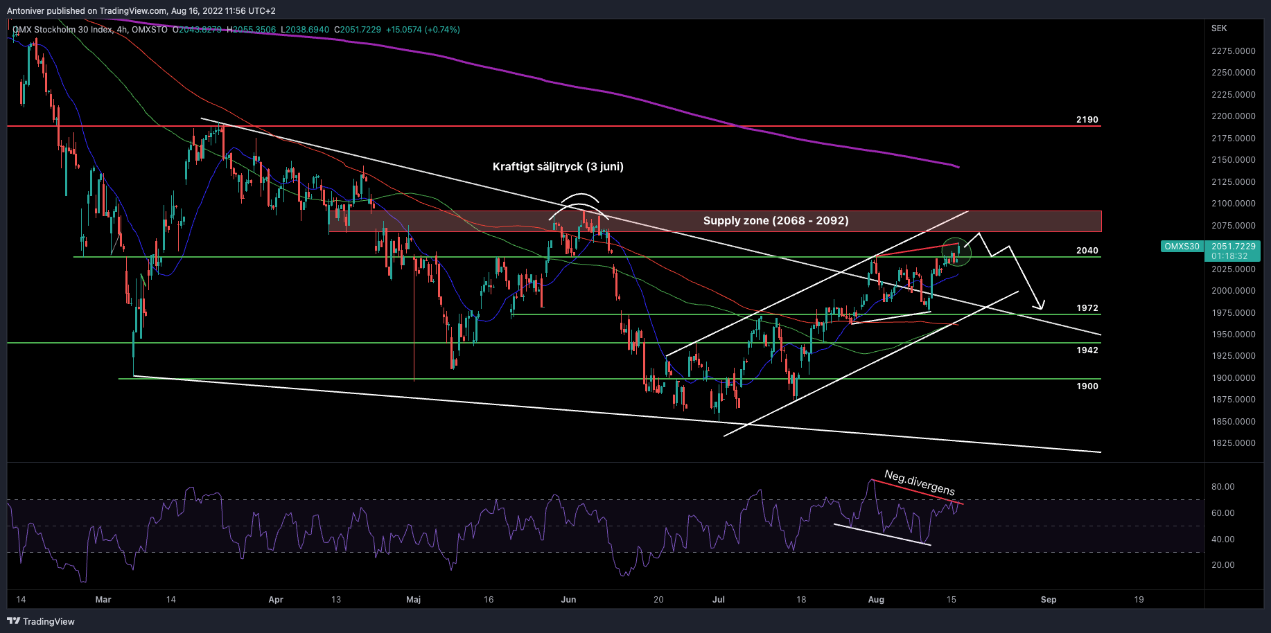 OMXS30 bryter över 2040 – närmar sig supply zone