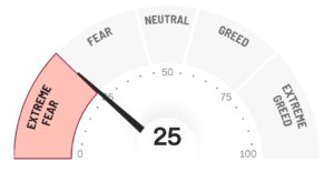 Nedan ser vi månadsgrafen över volatilitetsindexet VIX som senaste två veckorna fullständigt lossnat ur en längre dvala samt veckobarometern över Fear & Greed Index. Den senare har på bara en månad sjunkit från Extreme Greed-nivåer till Extreme Fear, vilket säger det mesta om oron i marknaden.