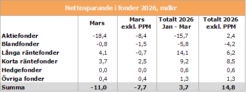 Under mars uppvisade fonder ett sammanlagt nettoutflöde på 11 miljarder kronor. Aktiefonder hade nettouttag på 18,4 miljarder kronor, medan blandfonder noterade nettouttag på 0,8 miljarder kronor.