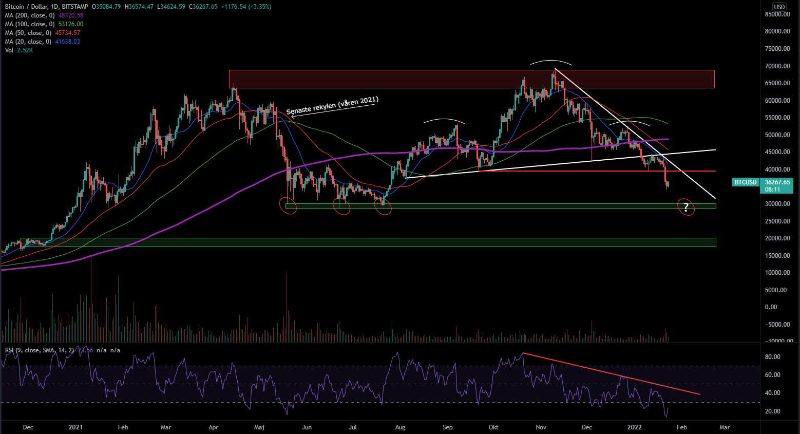 Bitcoin befinner sig mer än 20 procent under sin 52-veckors högsta vilket innebär att kryptovalutan befinner sig i en “Bear marknad”. Nedgången har tilltagit sedan toppnoteringen och värdet har halverats på väldigt kort tid. Bitcoin och många andra kryptovalutor är kända för sin höga volatilitet, något som möjligtvis är ett resultat av att tillgången är väldigt enkel att spekulera i. Vissa tror att Bitcoin ska vara värt avsevärt mycket mer än exempelvis 35 000 USD medan andra menar att valutan i sig är helt värdelös. Dessutom tror jag att teknisk analys är mer applicerbart på krypto överlag just för att det inte kommuniceras lika mycket fundamental information till marknaden jämfört med vad som kommuniceras via ett börsnoterat bolag. Detta leder till att flera använder sig utav teknisk analys och det betyder i sin tur att marknaden reagerar starkare när tekniska signaler genereras eller vid psykologiska prisnivåer såsom 30 000, 40 000 och 50 000 USD.