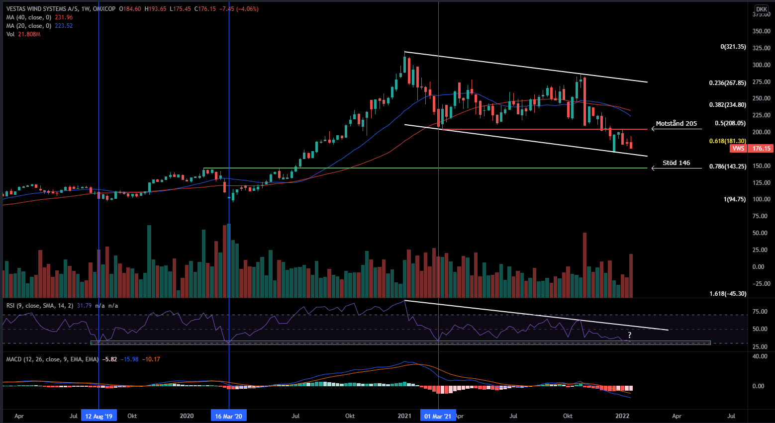 Vestas är ner närmare 45 procent från sin högsta topp på 321 DKK som printades under början av fjolåret. Aktien har sedan dess pendlat i en nedåtgående trendkanal som kan ritas ut genom att knyta ihop de två senaste topparna och de två senaste bottnarna. I dagsläget befinner sig Vestas Wind Systems i den nedre delen av den breda trendkanalen efter att studsat kraftigt på trendgolvet för några veckor sedan. I den rörelsen steg Vestasaktien dryga 15 procent under en kort period, dock representerades uppgången av svag volym och aktien har rekylerat ner efter att ha slagit i motståndet kring 205 DKK med allt högre volym.