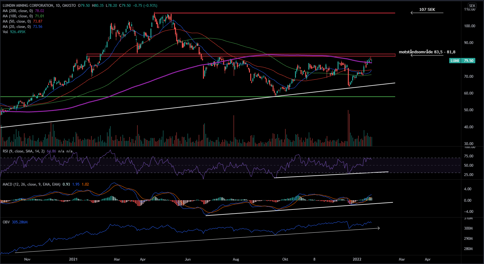 Aktien bröt under primärtrenden i somras och lyckades inte ta tillbaka nivån vilket ledde till att aktien rörde sig nedåt och sedan dess har aktien befunnit sig i en konsolideringsfas. Under föregående veckan tog sig Lundin Mining över primärtrenden och har testat av nivån vid två tillfällen och hittills har MA 200 agerat som stöd vilket är positivt. De andra glidande medelvärdena har börjat få en allt positivare lutning och om de så småningom lyckas ta sig över MA 200 så är min tro att aktiekursen sätter sikte på de tidigare topparna kring 107 SEK.