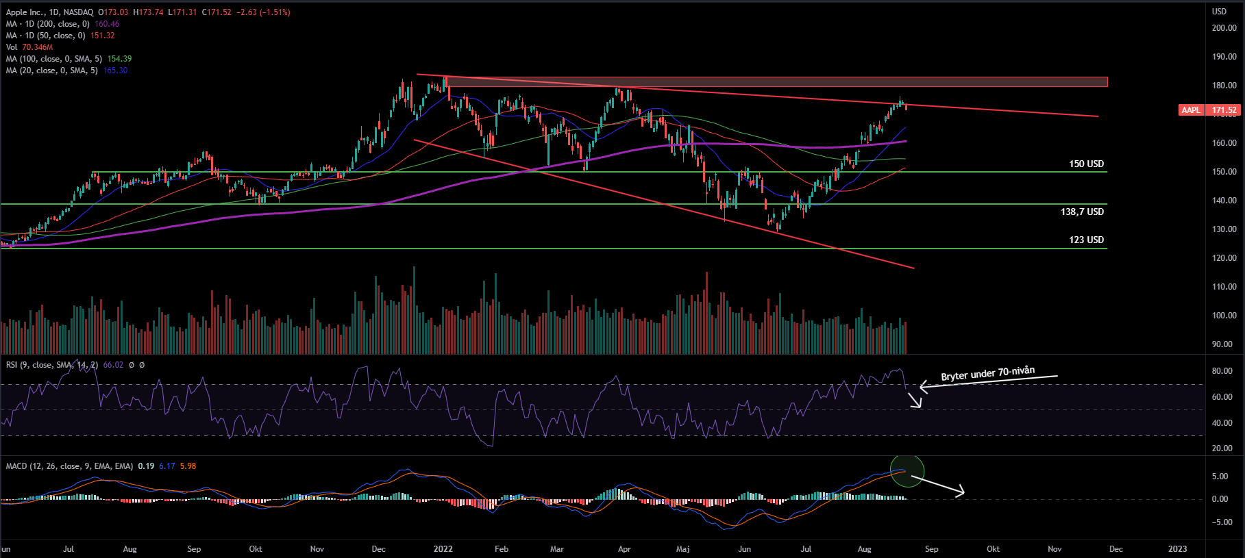 Under fredagen föll Apple cirka 1,5 procent och därmed föll även RSI under 70-nivån. Om köparna inte snabbt kommer tillbaka så tror jag RSI ska leta sig tillbaka till mer normala nivåer, exempelvis 50. Det mesta talar för en kortsiktig rekyl nedåt, rimligtvis mot primärtrenden som befinner sig kring 160 USD. I MACD kan vi även se att ett negativt medelvärdeskors håller på att printas en bra bit över nollnivån. Det mesta är med andra ord stretchat och en rekyl är inte alls orimlig efter en sådan hastig uppsving i aktiepriset. På nedsidan finns dock en rad olika stödnivåer, exempelvis samtliga glidande medelvärdena men också horisontella stödnivåer (150, 138,7 OCH 123 USD).