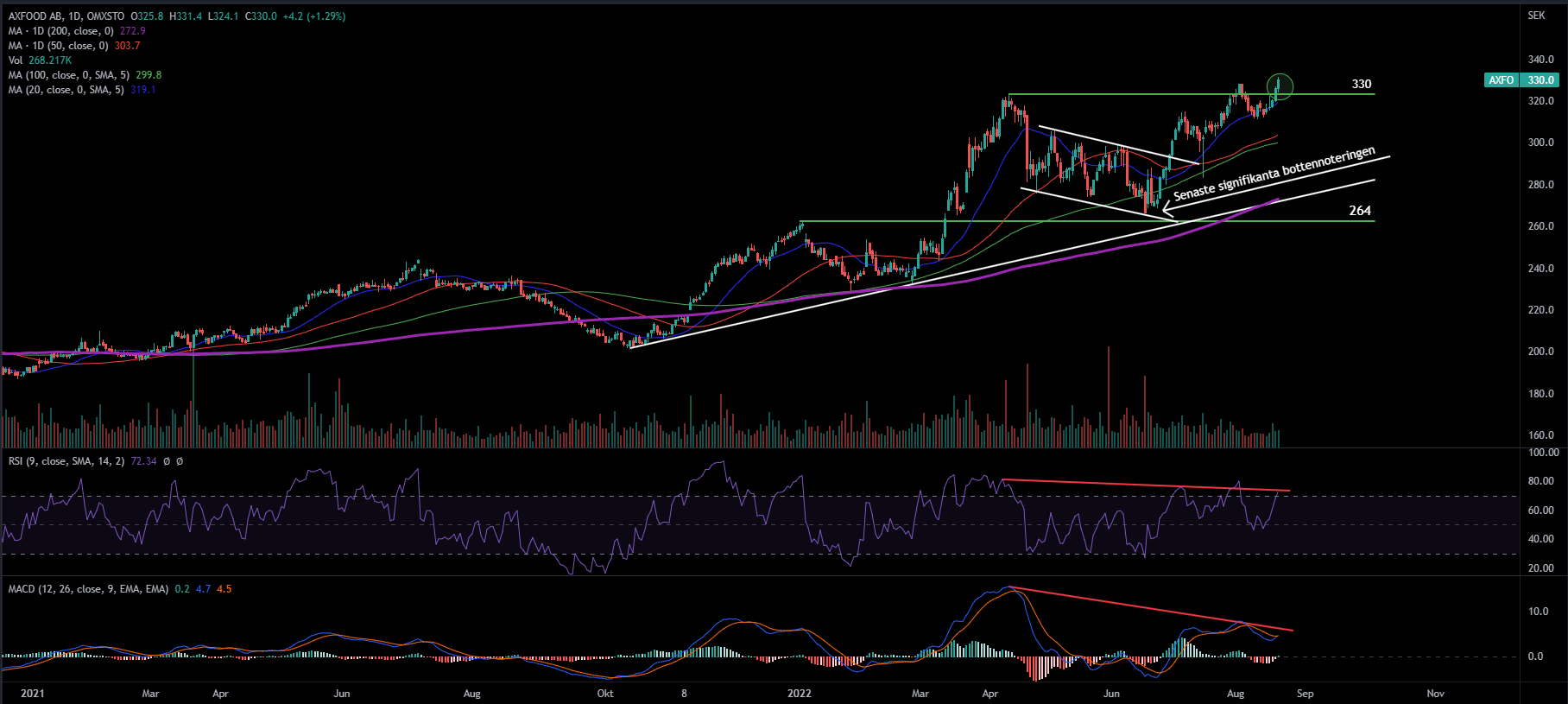 Axfood noterade ett nytt All time high under fredagens handel och lyckades stänga dagens handel i närheten av den prisnivån. Aktiekursen har gått väldigt starkt under större delar av året och visar återigen på ny styrka. Trenden är fortsatt positiv där högre bottnar följs upp av allt högre toppar. Aktiekursen befinner sig dessutom ovanför primärtrenden som har en fortsatt positiv lutning, detta bekräftar den stigande trenden där köpare accepterar ett högre pris med tiden.