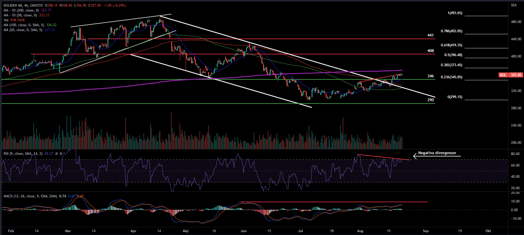 Boliden gick starkt inledningsvis under året, dock har i princip hela uppgången raderats ut under de senaste tre månaderna. Boliden bottnade kring 300 SEK under början av juli och har sedan dess visat på ny styrka. Sedan bottennoteringen är aktiekursen upp lite över 20 procent, drivet av en generellt piggare börs. Aktiekursen har tagit sig över de två kortsiktiga glidande medelvärden vilket signalerar ett allt positivare momentum i ett kortsiktigt perspektiv. Sedan en vecka tillbaka lyckades även Boliden ta ut trendtaket av den fallande trendkanalen, en prisnivå som tidigare har respekterats. Nu återstår det att se om aktiekursen orkar hålla sig ovanför den uttagna nivån och framförallt om aktiekursen lyckas etablera sig ovanför primärtrenden som i dagsläget har en svagt positiv lutning.