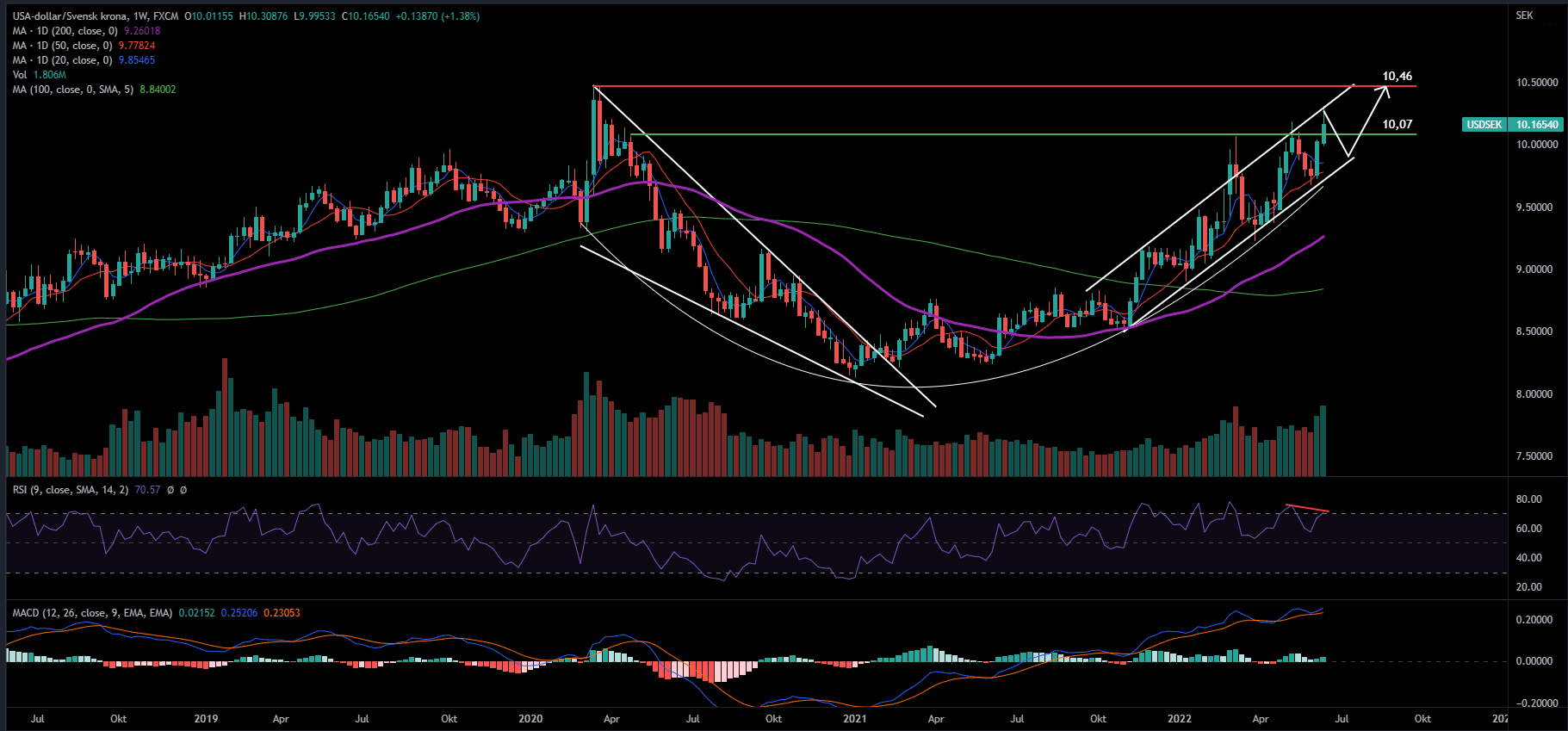 USD/SEK har hittills i år gått väldigt starkt och befinner sig runt omkring tidigare all time high-nivåer. Under söndagskvällen stod den amerikanska dollarn i 10,23 och befinner sig därmed i en den övre delen av den stigande trendkanalen som bildades efter att valutaparet satte en botten under våren 2021. Senast vi tittade på den amerikanska dollarn så befann den sig även då kring trendkanalens tak, då förutspådde vi att den skulle ner mot trendgolvet, vilket sedan skedde. Jag ser ett liknande scenario framgent, alltså att vi ska ner till trendgolvet återigen. Denna tes baseras främst på att det råder negativa divergenser i RSI över 70-nivån. Dessutom kan vi se att priset har rört sig tillbaka under veckan vilket har resulterat i att en svans på senaste stickan har blivit lång, något som indikerar att köpkraften börjar pysa ut kortsiktigt. Med det sagt tycker jag det mesta talar för att en mindre sättning står framför oss. Dock kan vi se att volymen är stark samtidigt som trend är starkt positiv och kursen befinner sig även över både kort- och långsiktiga glidande medelvärden, något som är hälsosamt.