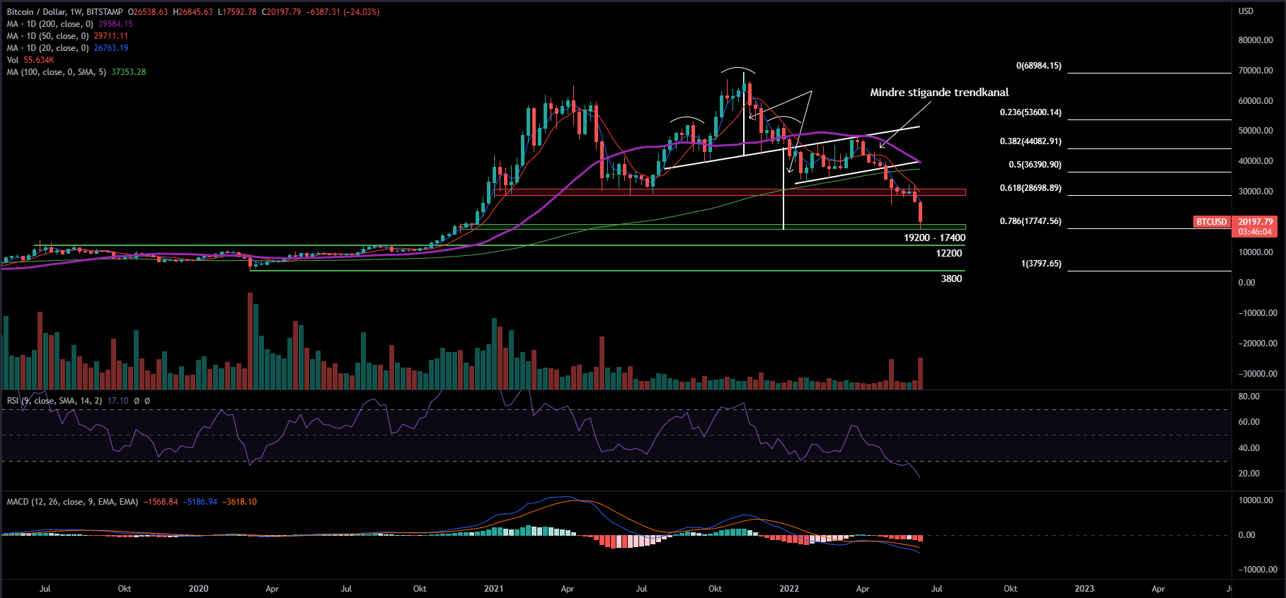 Bitcoin har upplevt en extremt slagig resa tillsammans med andra kryptovalutor under 2022. Bitcoin är ner cirka 70 procent från toppen som sattes under november 2021 och under den senaste tiden har nedgång tilltagit mer än vad många förmodligen hade räknat med. Jag personligen flaggade för att kryptovalutan skulle testa av 30 000 USD vid ett scenario där det skulle ske ett utbrott söderut från den mindre stigande trendkanalen. Kring denna nivå trodde jag personligen att köparna skulle komma tillbaka tillfälligt för att således skapa någon form av konsolidering i tid. Prisnivån visade sig inte hålla och därmed togs även fib 0,618 ut vilket resulterade i att nedgången accelererade.