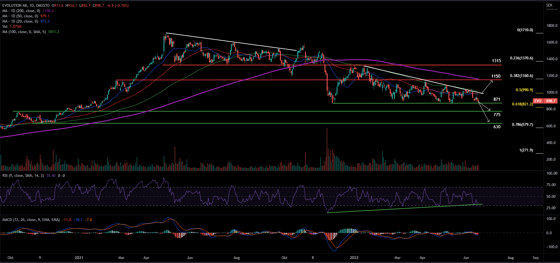 Det känns som att marknaden måste bestämma sig inom kort hur aktiepriset ska ta sig ur denna formation. Om stödzonen tas ut finns det risk för nedgång, först mot 775 och om köparna inte lyckas försvara denna nivå så finns det risk för att 630 sätts i spel. Mätt från Coronabotten till all time high-noteringen kring 1700 SEK så befinner sig aktiekursen strax ovanför fib 0,618. I dagsläget befinner sig aktiekursen under samtliga glidande medelvärden vilket indikerar ett försvagat momentum i aktiekursutvecklingen. För att sammanfatta den rådande tekniska biten så kan jag väl tycka att det finns några varningssignaler som än så länge inte har utvecklats till tydliga säljsignaler. Evolution befinner sig fortsatt ovanför viktiga stödnivåer som fib 0,618 och 871 SEK samtidigt som högre bottnar sätts i RSI och MACD vilket tyder på att det finns en dold underliggande styrka bland köparna.