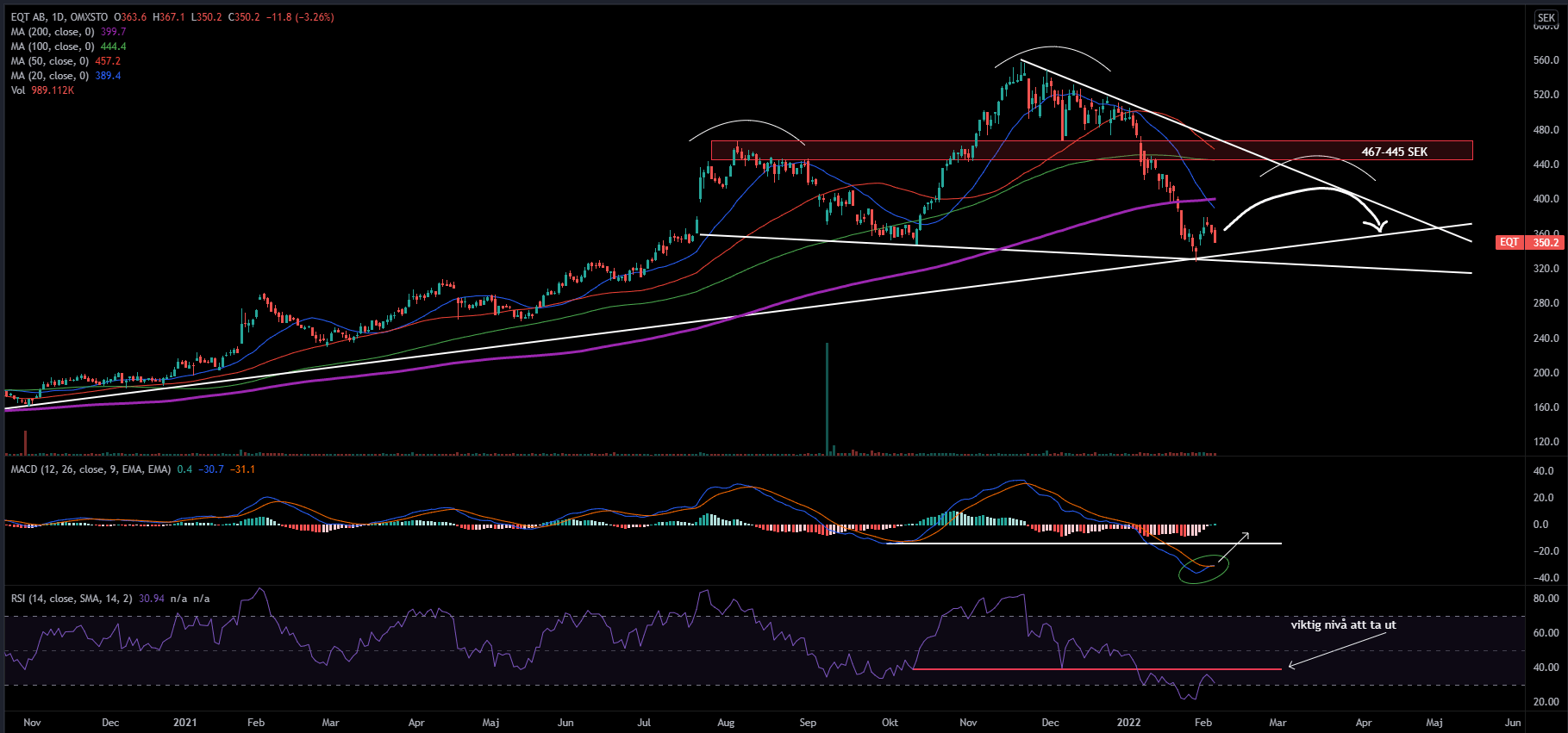 För det första kan man utläsa skapandet av en potentiell huvudskuldra-formation, vänstra skuldran och huvudet har formats och nu återstår det att se huruvida höger skuldran formas. Om högra skuldran formas någonstans i stil med hur jag ritat ut ett i det potentiella scenariot betyder det att vi skulle få en negativt lutande nacklinje, något som skulle peka ännu mer mot att ett trendskifte är på gång att ske. I övrigt finns det även tydliga motståndsnivåer på uppsidan, närmast ligger primärtrenden som för varje dag börjar få en allt flackare lutning. Sedan mitten av januari så har EQT handlats under MA200, detta är första gången som MA 200 noteras över aktiekursen för EQTs del som noterades under 2019. Ovanför MA 200 finns även ett horisontellt motståndsområde vid 467 – 445 SEK. Om aktiekursen skulle testa av denna nivå men få svårigheter att bryta sig över så ökar risken markant för att en huvudskuldra-foramtion skall formas till slut. Dock sker bekräftelsen först när aktiekursen faller under den fallande nacklinjen.