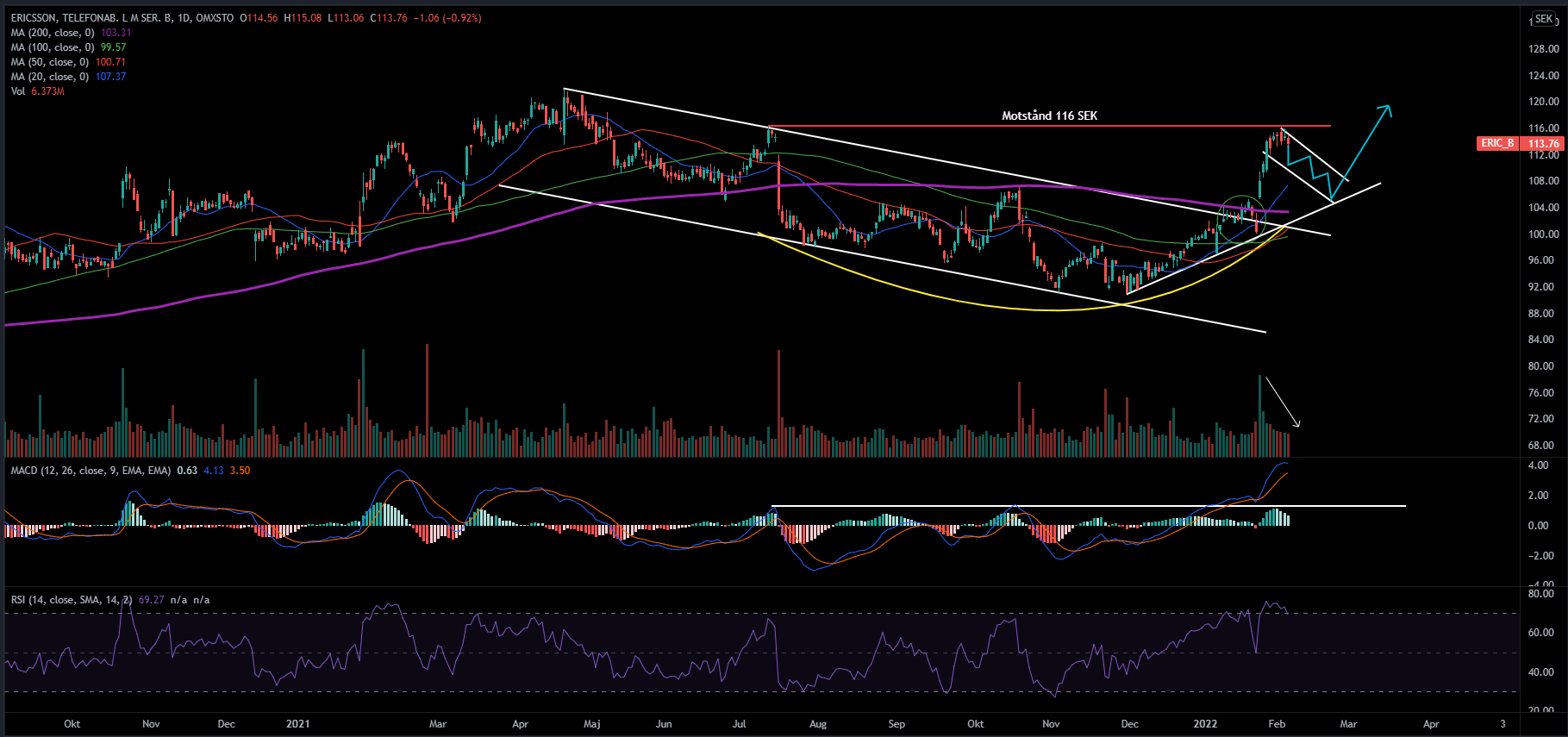 Ericsson är den aktie som gått bäst i år bland OMXS30-bolagen, aktiekursen har lyckats generera en avkastning om 14 procent under samma period som OMXS30 är ner närmare 7 procent, det skiljer sig alltså närmare 21 procentenheter mellan Ericssons aktiekurs och indexet. Rent tekniskt har Ericsson lyckats bryta sig över det fallande trendtaket som vid tidigare skeden har agerat som ett motstånd. Utbrottet skedde i samband med Ericssons rapportering av fjärde kvartalet 2021 som togs emot väl av marknaden. På rapportdagen var Ericsson upp cirka 8 procent och den positiva volymen var den högsta sedan 29e januari 2021 vilket intressant nog var dagen då Ericsson presenterade fjärde kvartalet för 2020.