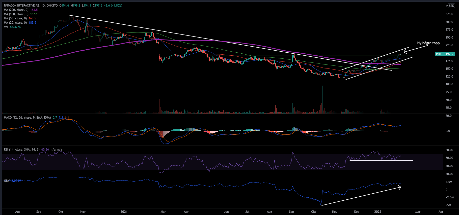 Paradoxs aktiekurs har varit väldigt pressad under en lite längre tid tillbaka. Som mest var Paradox ner mer än 64 procent från sin ATH-notering som sattes på 321 SEK under hösten 2020. Sedan mitten av december 2021 har den tekniska bilden blivit allt mer positiv eftersom det fallande trendtaket tagits ut som tidigare agerade ett starkt motstånd. Med andra ord har ett utbrott skett och Paradox noterar sig över samtliga glidande medelvärden för första gången sedan början Q1 2021.