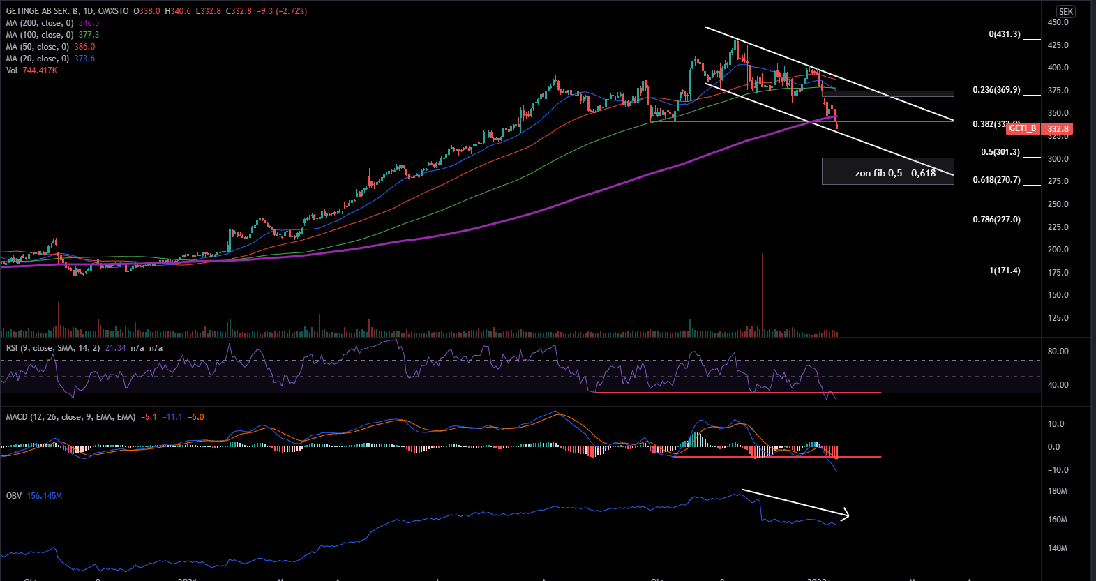 Getinge har sedan mitten av november format en fallande trendkanal där lägre bottnar följs upp av lägre toppar. Sedan 52-veckors ATH-noteringen som sattes i november är aktien ner över 20 procent och befinner sig därför i en bear trend. Kursfallet har inneburit att viktiga stödnivåer har tagits ut och jag ser tyvärr inte några positiva signaler än som skulle tala för att den negativa trend bryts inom närtid. Vi kan konstatera att aktiekursen nu noteras under samtliga glidande medelvärden där primärtrenden togs ut under den föregående veckan. I samma rörelse som MA 200 togs ut så föll även det horisontella stödområdet kring 341 SEK.