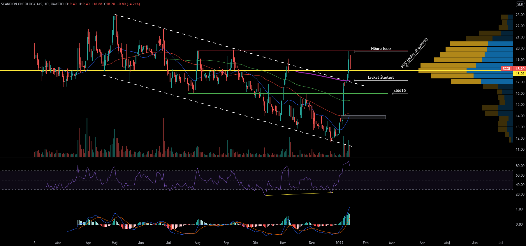 Det som är intressant nu är att det fallande trendtaket har tagits ut med tilltagande volym vilket enligt mig är en väldigt positiv signal givet att aktiekursen inte lyckats ta ut nivån vid tidigare skede, med andra ord visar Scandion Oncology på relativ styrka. I och med den senaste prisrörelsen har viktiga motstånd tagits ut. Först och främst har det horisontella stödet kring 16 SEK tagits ut som tidigare har agerat stöd och motstånd. Sedan togs trendtaket ut och även POC som är den nivå som representerar störst andel av den historiska handelsvolymen.