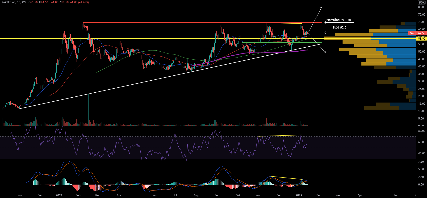 Min vy och min tro är att Zaptec kommer uppleva svängningar inom närtid eftersom den måste bestämma sig om den ska bryta upp eller ner från triangelformationen som har skapats under en längre tid. Med andra ord tror jag på ökad volatilitet framöver vilket betyder att det kan komma att ske kraftiga rörelser antingen söder- eller norrut. I kursgrafen kan vi se att det börjar bli tajtare för varje dag som går mellan den stigande trendlinjen och det horisontella motståndet runt 69 – 70 NOK. Man kan visualisera det som att aktiekursen klämms ihop och tvingas därmed bestämma sig för nästa prisrörelse.