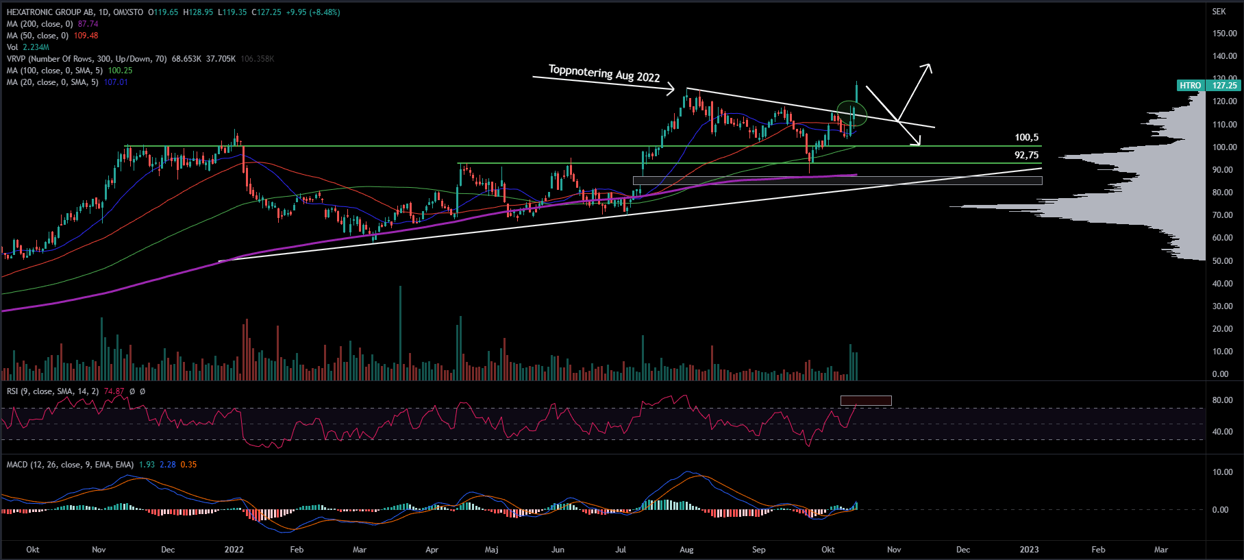 Den tekniska biten för Hexatronic är positiv och utsikterna för aktiekursutvecklingen på medellång och lång sikt ligger fortsatt intakt. Den positiva trenden håller i sig, något som ytterligare bekräftas av att Hexatronic handlas ovanför samtliga glidande medelvärden. Detta talar för att efterfrågan på aktien är stark ur både ett kortsiktigt men även ur ett mer långsiktigt perspektiv.