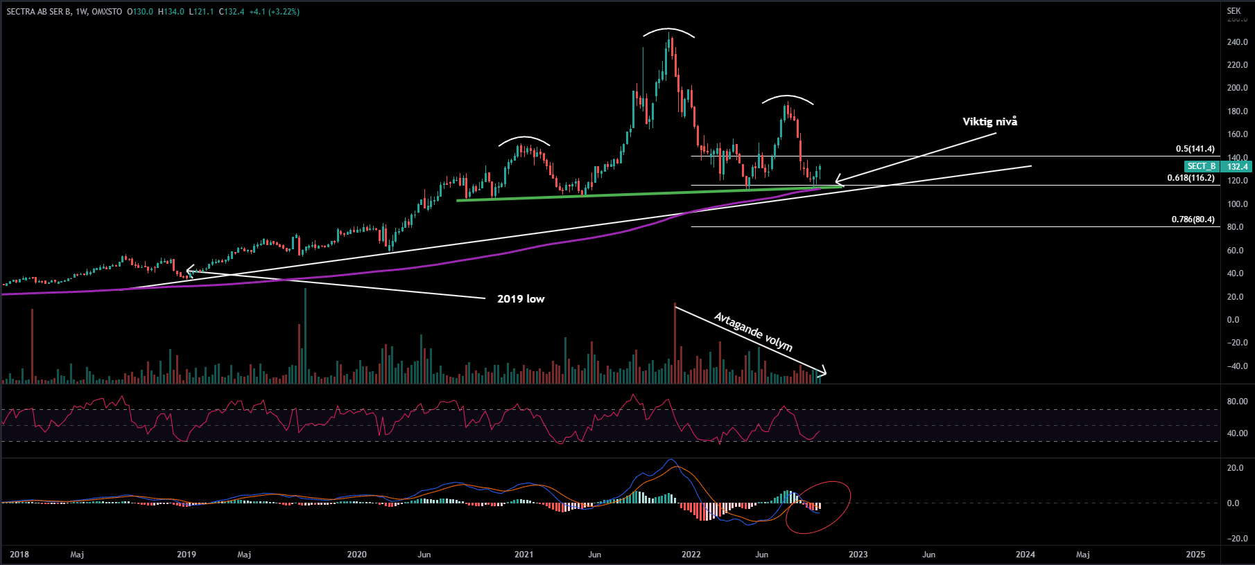Strax under nacklinjen kan vi se den långsiktig trendlinjen, om den tas ut i samband med primärtrenden (200 veckor) så skulle jag våga säga att den positiva trenden är bruten, vilket öppnar upp för mer nedsida. Hittills kan vi se att Sectra har studsat på nacklinjen och har stigit under de tre senaste veckorna. Motreaktionen har varit stark sedan senaste bottennoteringen vid 113 SEK. Vid denna prisnivå återfinns MA 200 (veckor), Fib 0,618 mätt från low 2019 och slutligen den stigande nacklinjen. Denna nivå är väldigt viktig för aktiekursen på kort och medellång sikt. Om köparna börjar ge upp kring denna nivå tror jag det kan vara läge att gå kort.