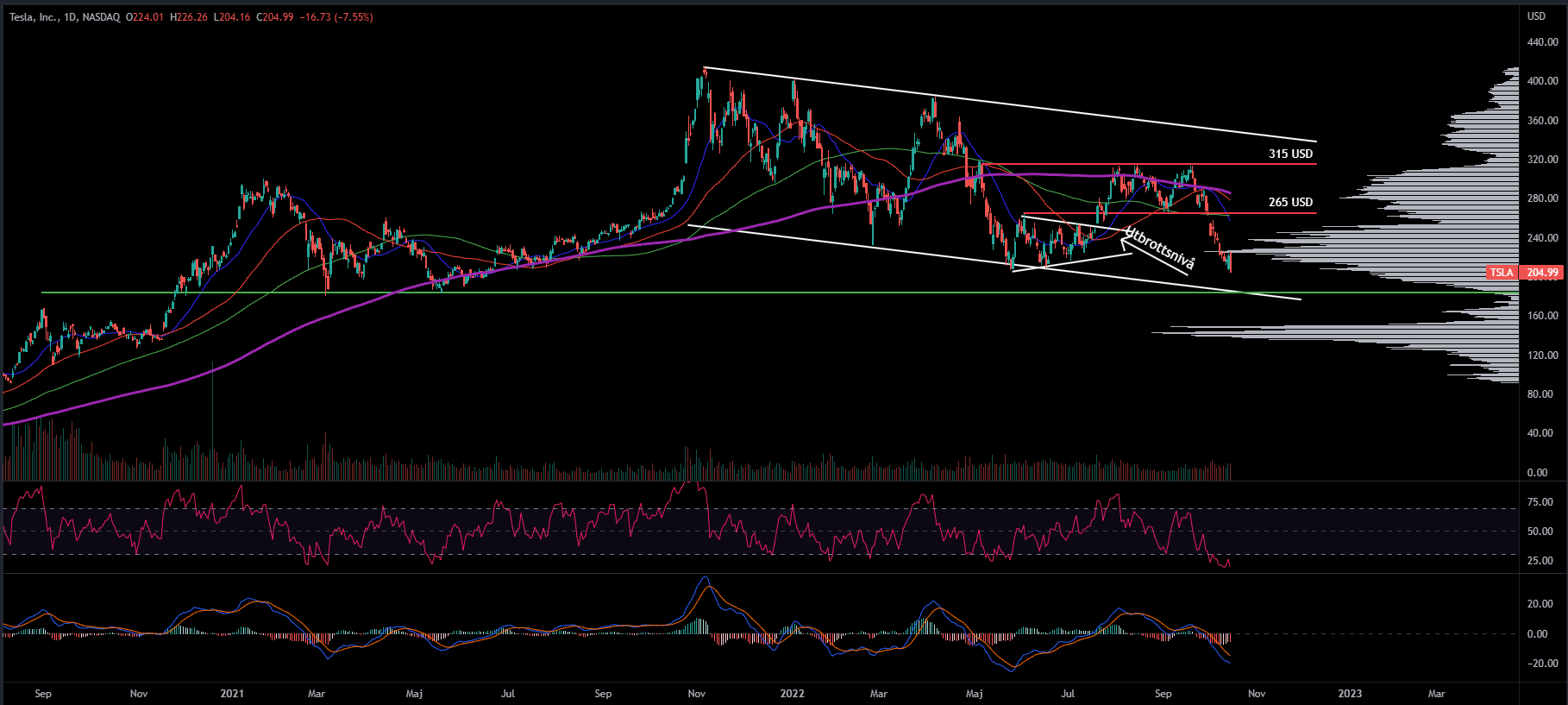 Under fredagens handel formades en Bearish Engulfing, en candlestick med negativ underton. Detta motiverar att aktiekursen kan falla mer kortsiktigt, i alla fall enligt den tekniska biten. Dock gäller det att göra en helhetsbedömning för att få en tydligare bild kring hur aktien kommer handlas. Vi kan se att Tesla har handlats inom en bred fallande trendkanal sedan all time high-noteringen som sattes november 2021. Nu befinner sig aktiekursen i den nedre delen av trendkanalen och vid tidigare skeden har aktiekursen lyckats studsa upp rätt så kraftigt ifrån dessa nivåer. Samtidigt ser vi att RSI noteras i det översålda territoriet vilket tidigare inneburit att en kortsiktig rekyl uppåt har tagit fart. Ha i åtanke att för att göra en mindre riskfylld entry så kan det det var värt att invänta ett utbrott ifrån det översålda territoriet (30-nivån). MACD har än så länge inte format ett positivt medelvärdeskors, detta skulle även vara något att invänta för en bättre entry.