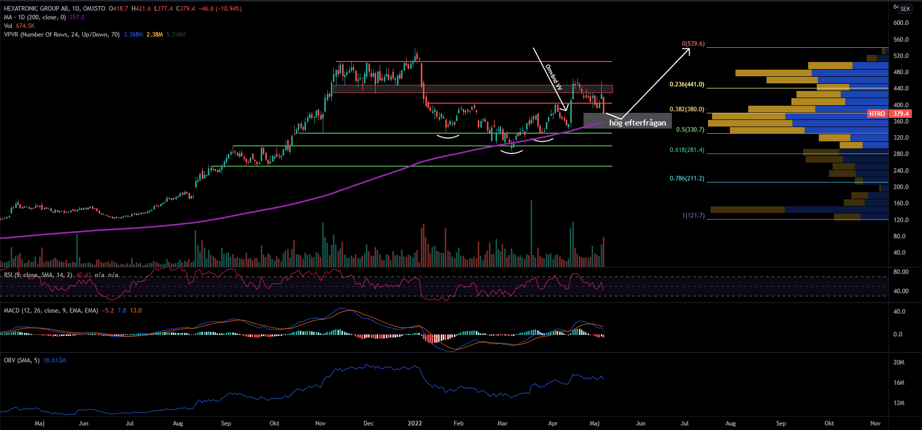 Något jag personligen gillar med grafen är att marknaden har respekterat primärtrenden när kursen väl har befunnit sig kring de nivåerna. I samband med studsarna på MA 200 så tycker jag mig se en omvänd huvudskuldra och när den omvända vinstvarningen kommunicerades så bröt sig kursen över den horisontella nacklinjen. Dock kan vi se en motståndszon som under 2021 fungerade som en stödnivå. Initialt steg aktiekursen över denna zon men lyckades tyvärr inte hålla sig ovanför allt för länge. Kursen gick ner efter den drastiska uppgången och har nu även brutit sig under nacklinjen med stor volym. I torsdags kan vi se en svag grön ljusstake, dagshögsta var 457 SEK men stäningskursen var tydligt lägre vid 426 SEK. Under fredagen handlades Hexatronic ner närmare 8,5 procent och jag tror att primärtrenden skall testas av igen innan potentiell vidare uppgång.