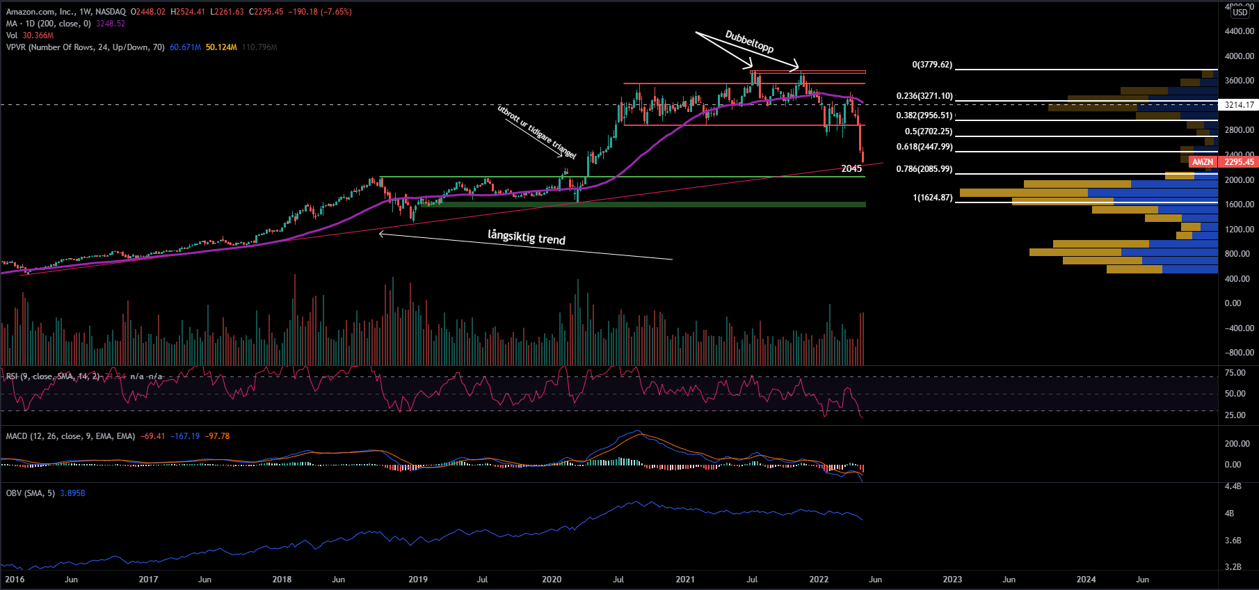 Om vi backar bandet en bit kan vi se att Amazon steg kraftigt under coronautbrottet då efterfrågan på deras produkter och tjänster förväntades få ett uppskjut. Efter att aktiekursen bröt upp ur en konsolidering som även höll i cirka ett och ett halvt år (mellan 2018 – 2020) så avancerade Amazon cirka 100 procent på väldigt kort tid. Sedan gick aktiekursen in i en långvarig konsolidering där priset pendlade mellan 2900 och 3550 USD. Vid två tillfällen skedde två falska utbrott på uppsidan vilket kan tolkas som en dubbeltopp. Detta resulterade i att aktiekursen snabbt sökte sig ner mot rangens golv givet den ökade pessimismen. Kring 2900-nivån studsade aktien något för att sedan slå i MA 200 underifrån och köparna avisades tydligt. Detta resulterade i att rangens golv tog ut så småningomm, sedan Amazon utmanade primärtrenden underifrån så är aktien ner närmare 32 procent.