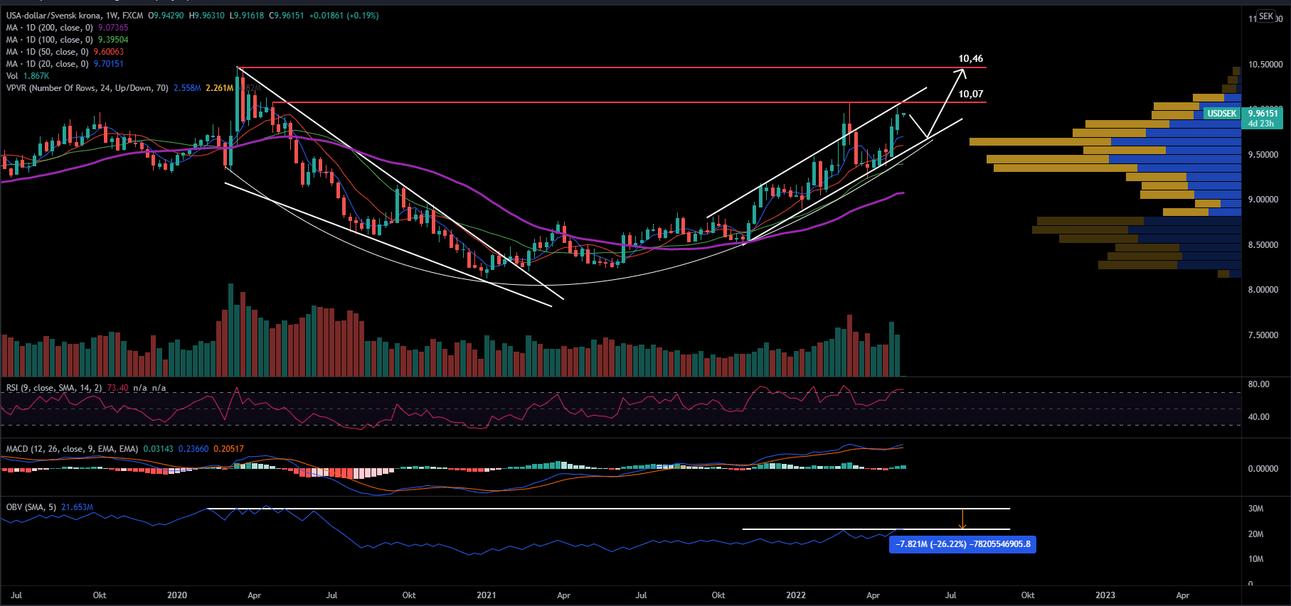 Jag är positiv till USDSEK, ett starkt momentum ligger bakom den senaste uppgången vilket syns tydligt i momentumindikatorn RSI som bara under något enstaka tillfälle har befunnit sig under 50-nivån i weekly. MACD talar samma språk och håller på att printa en signifikant högre topp om man jämför med topparna de senaste fem åren. Det enda som sticker mig lite i ögonen är den låga volymbalansen som idag befinner sig cirka 27 procent under nivån som printades i och med all time high-nivån som vi såg under 2020.