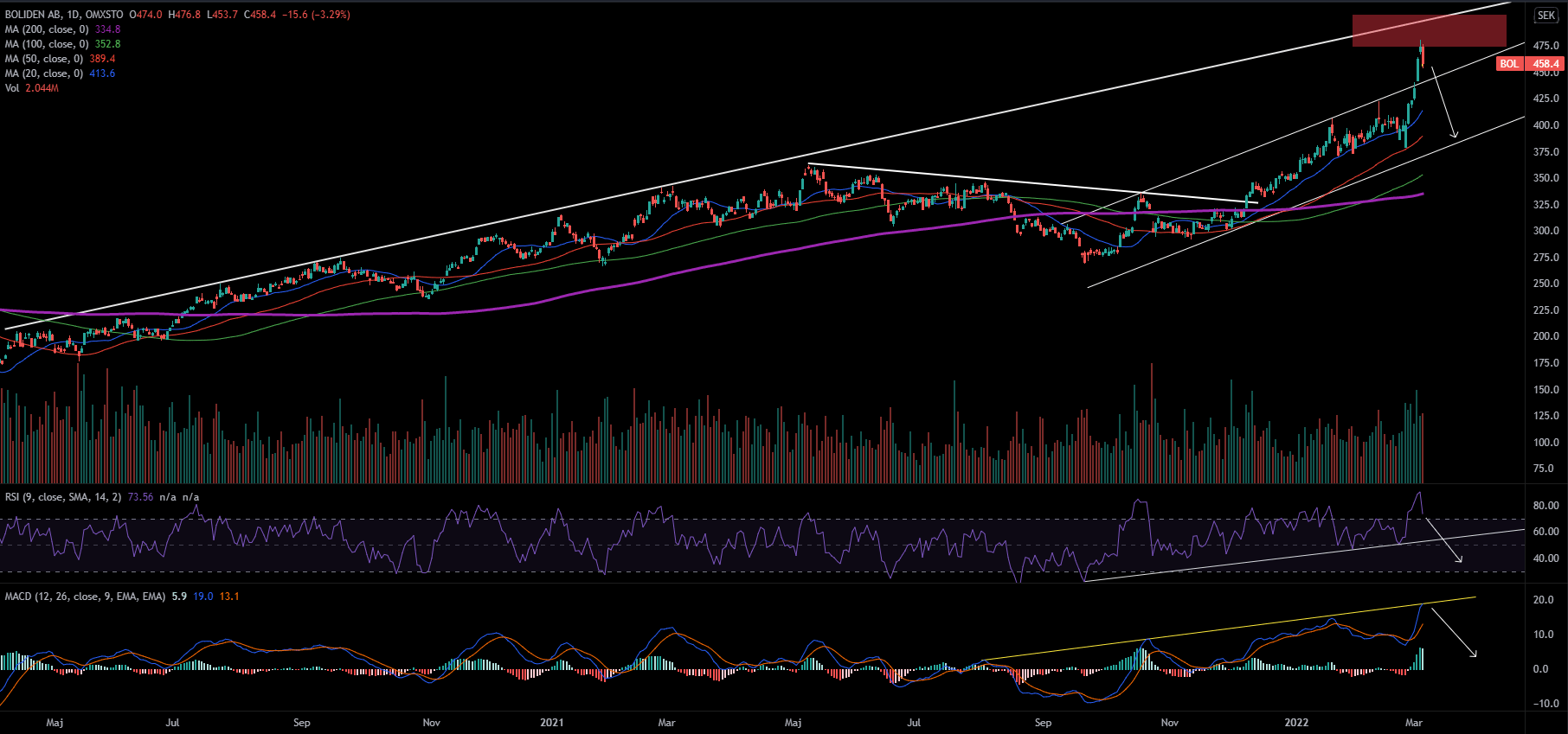 Boliden har sedan 25 februari stigit mer än 20 procent och aktien är tekniskt överköpt i ett kortsiktigt perspektiv. Momentumet har varit väldigt starkt som en följd av att bolagets operationella verksamhet gynnas av höjda priser på basmetaller såsom Nickel, Koppar och Zink. Dessutom är det inte många andra sektorer som gynnas i det klimat som råder nu, detta gör att många investerare väljer att allokera om kapital och söker exponering mot det som går starkt i stunden. Min tolkning är att Basic materials kommer gå starkt så länge det är oroligt på börsen, det som skulle kunna leda till en större sättning i denna sektor är om kriget deskalerar vilket får diverse basmetaller att komma ner.