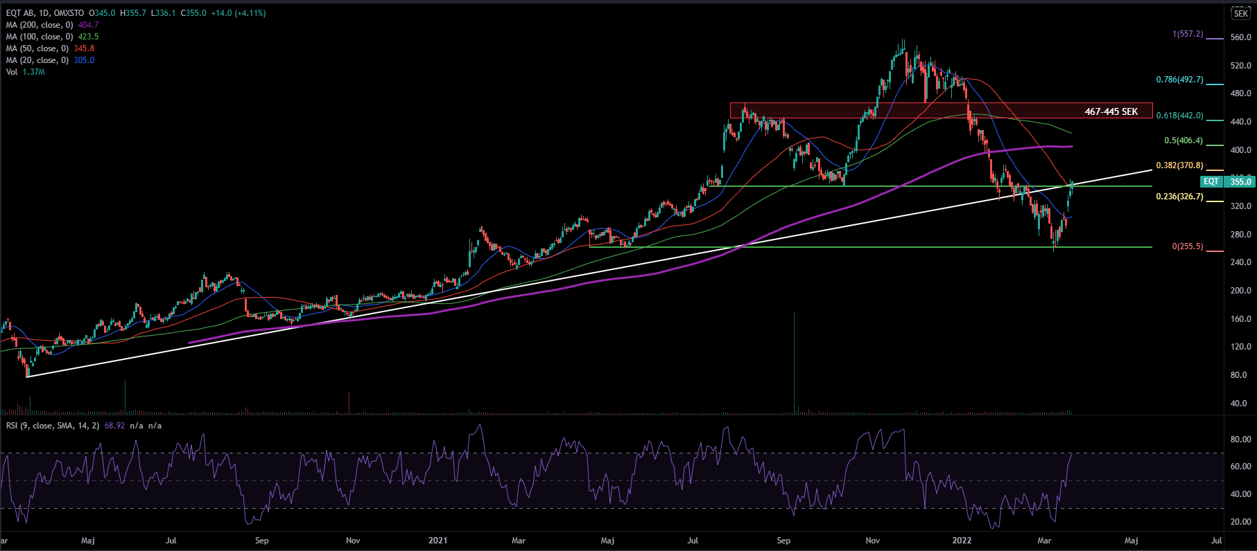 Senast vi tittade på EQT var i början av februari i år och då talade jag om en potentiell huvudskuldra-formation. Jag nämnde då att den högra skuldran skulle kunna formas under den kommande tiden, men så blev det inte. Jag hade fel i den tron och EQT brakade istället ner under nacklinjen och den positiva trendens golv. Nu, några veckor senare så har EQT hittat stöd vid 260 SEK och sedan aktien nuddade denna nivå så har kursuppgången varit drastisk. I fredags stängde aktien på 355 SEK vilket innebär att sedan bottennivån har en kursuppgång om cirka 35 procent skett.