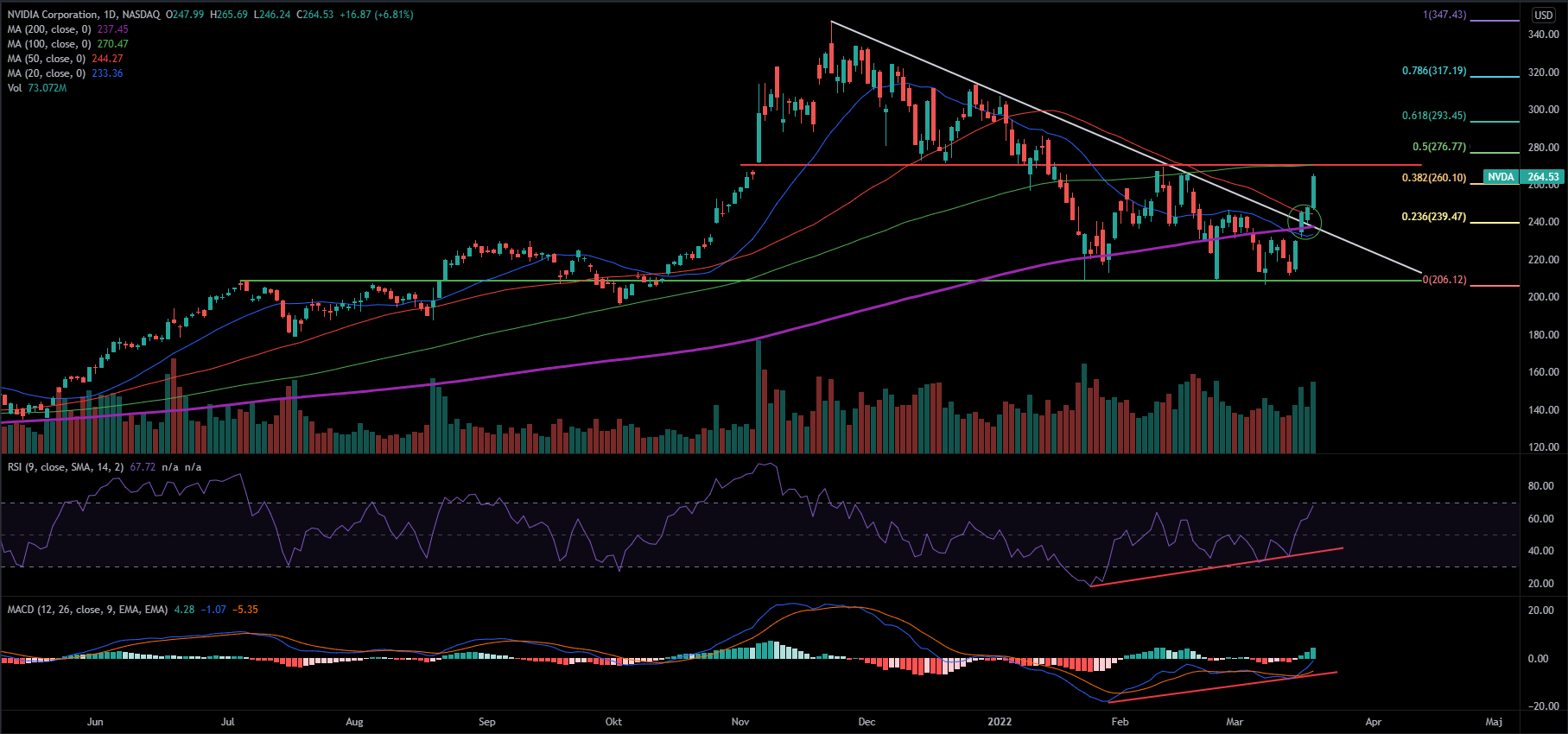 Nvidia har printat en rätt intressant kursgraf för tillfället, ett explosivartat utbrott har nämligen skett och syns tydligt med stora gröna ljusstakar. Aktien är upp närmare 25 procent på fyra handelsdagar och har alltså tagit sig över det fallande trendtaket med relativt attraktiv handelsvolym. Innan denna prisrörelse tog fart så hade Nvidia hittat ett starkt stöd kring 209 USD som kan kopplas till en tidigare motpol. Den nivån testades av flitigt och man kan nu i efterhand se att köparna stod redo vid denna nivån. Totalt sett testades nivån av fyra gånger för att sedan studsa upp kraftigt över bland annat primärtrenden som fortsatt har en positiv lutning trots senaste månadernas negativa kursutveckling.