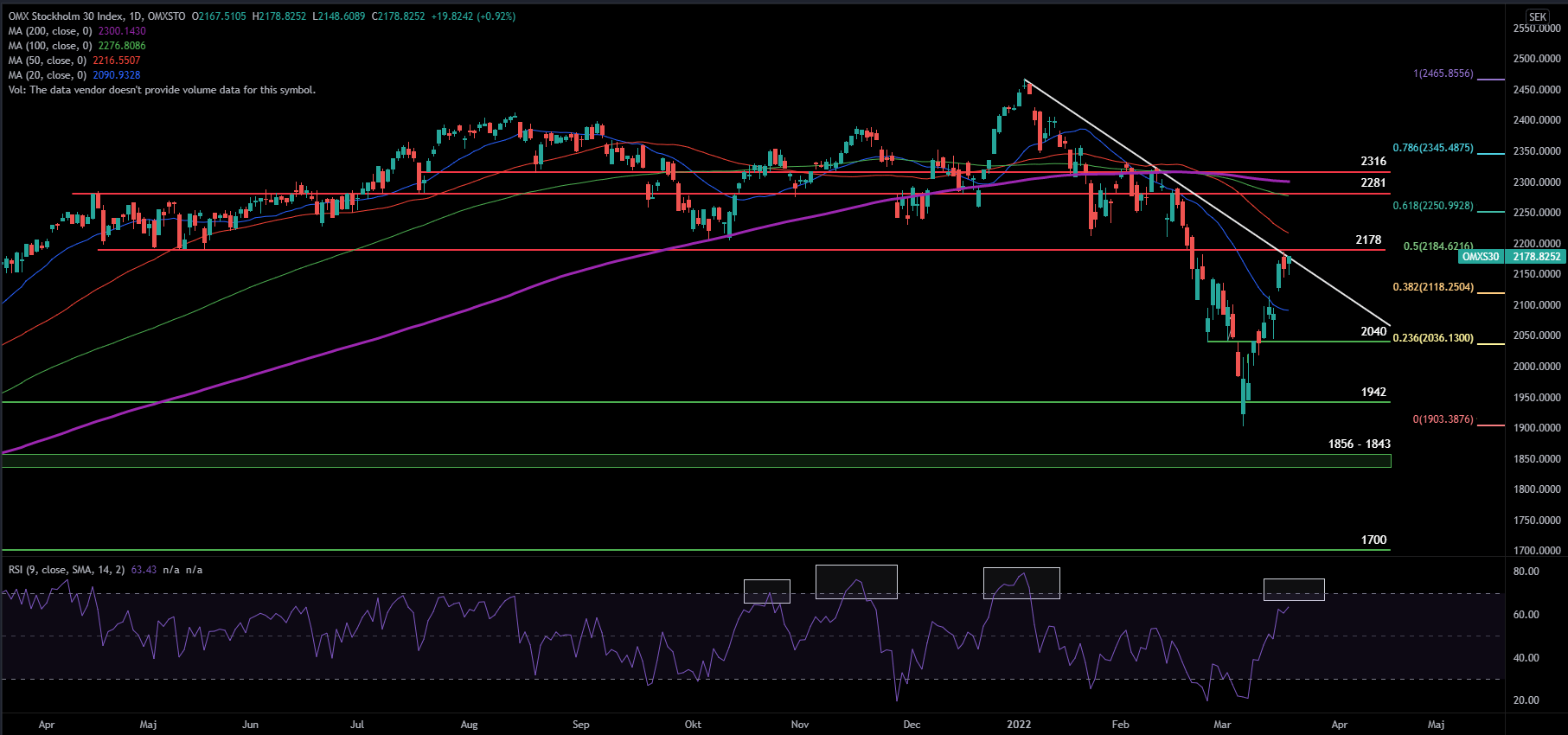 Viktigt att komma ihåg är att börsen drivs som allra mest av det som skrivs om kriget samt inflationsoron i diverse medier, dessa faktorer visar ingen hänsyn till några teoretiska regler inom teknisk analys.