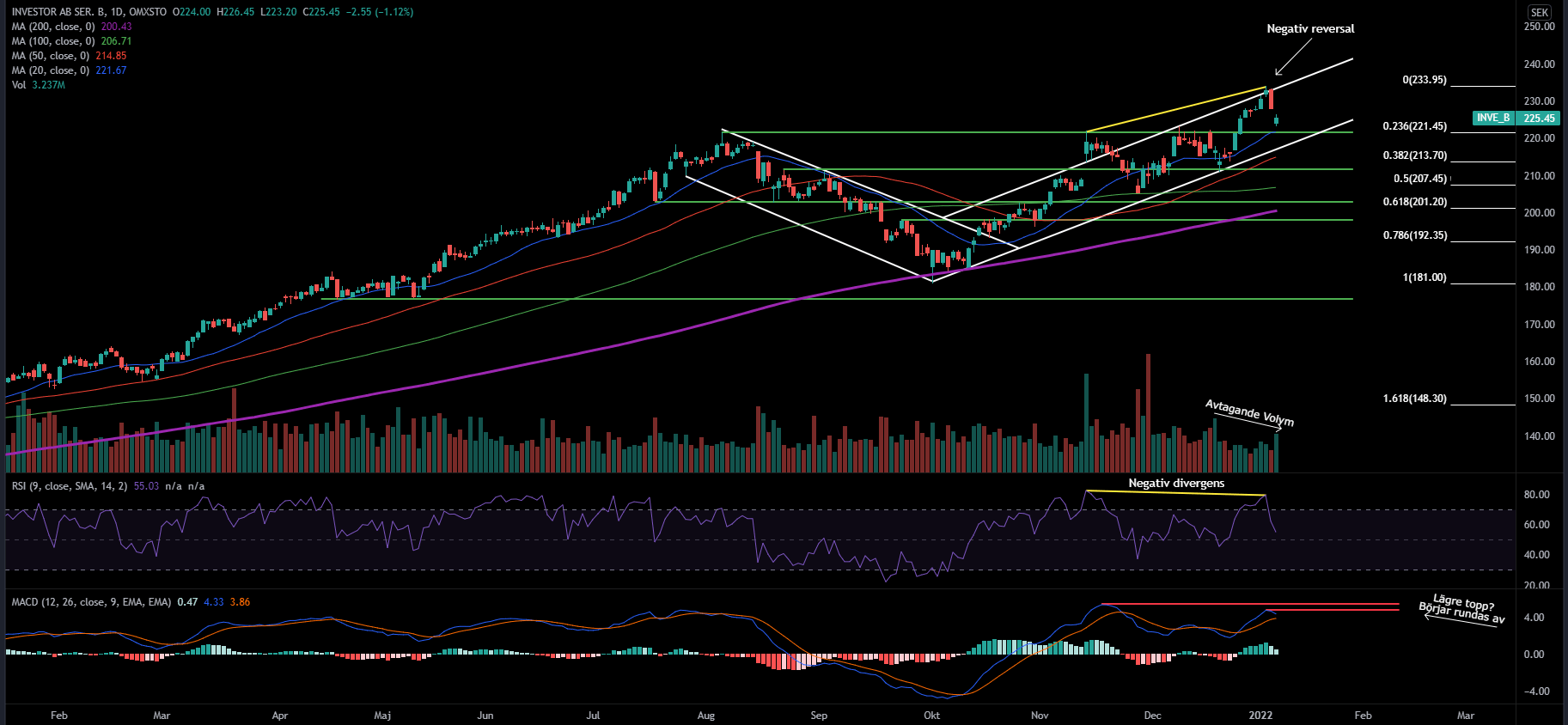 Investor har återigen satt ett nytt ATH och det gjordes tillsammans med OMXS30 under förra veckan. Det finns en relativt tydlig positiv korrelation mellan Investor och Stockholmsbörsen på grund av att en stor del av Investors portfölj består av bolag som återfinns i indexet. Investor är ett av de få investmentbolagen i Sverige som går att köpa till rabatt, trots detta faktum tycker jag det ser väldigt ansträngt ut rent tekniskt och kring toppnoteringar brukar Risk-reward vara begränsad i ett kortare perspektiv. Under torsdagen printades en “Bearish Engulfing”, en reversal som statistiskt talar för vidare nedgång.