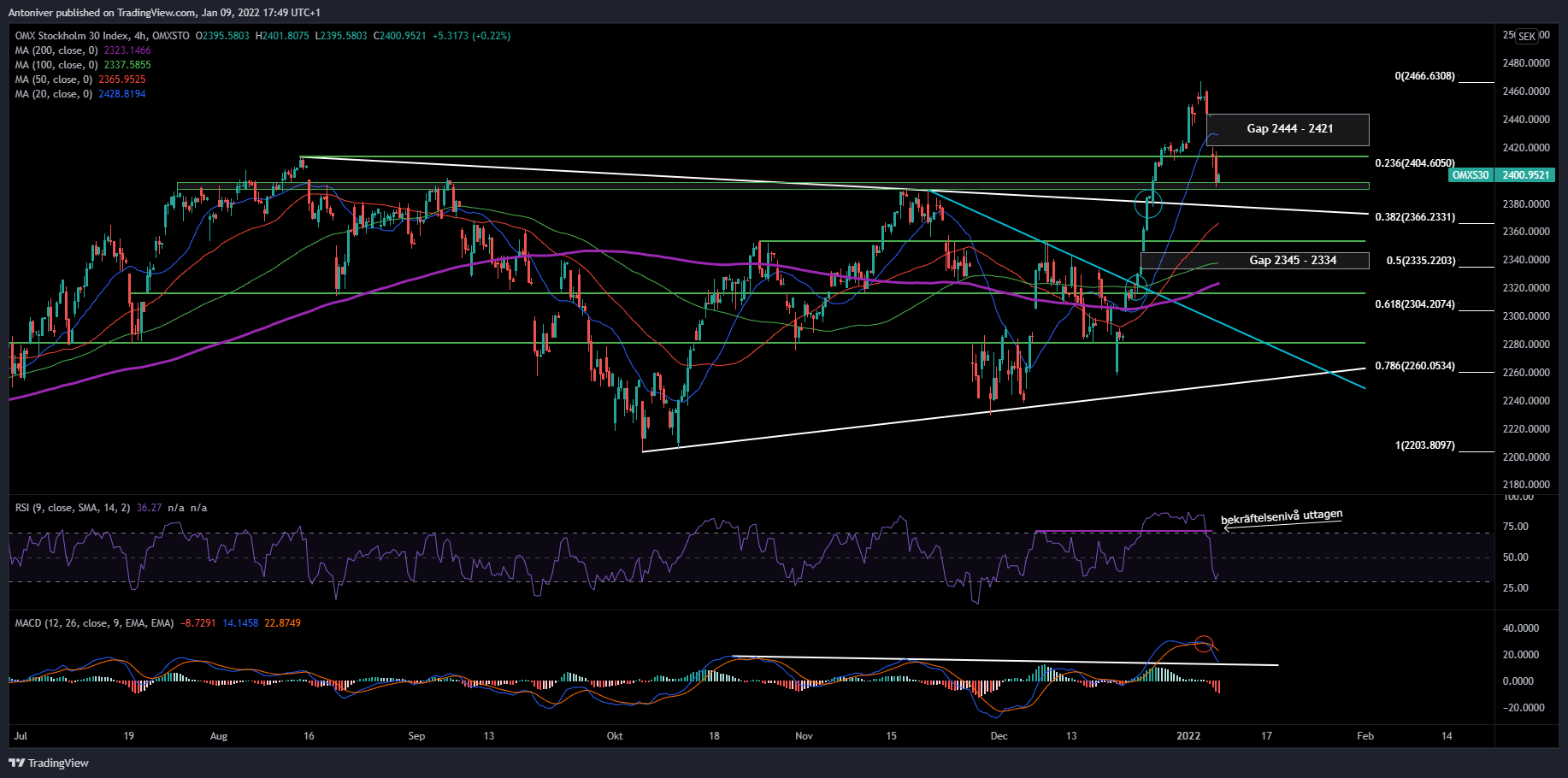 Vid utbrott ur dessa prisformationer brukar ett återtest ske tätt inpå för att bekräfta utbrottet. RSI 9 har under förra veckan tagits sig ner från extrema nivåer och i samma rörelse även tagit ut den tidigare toppen som kan ses som en bekräftelsenivå. Den bakomliggande uppgången är således inte lika stark uppe på dessa historiskt höga nivåer jämfört med styrkan i det tidigare skedet av uppgången. Jag personligen ser två potentiella nivåer som ska testas av, dels har vi det fallande trendtaket som ligger cirka XX procent under nuvarande kurs. Det andra stödområdet som kan tänkas testas av är den tidigare ATH-nivån vid 2414 som är en motpol. Denna nedgång skulle innebära en rekyl på xx procent.