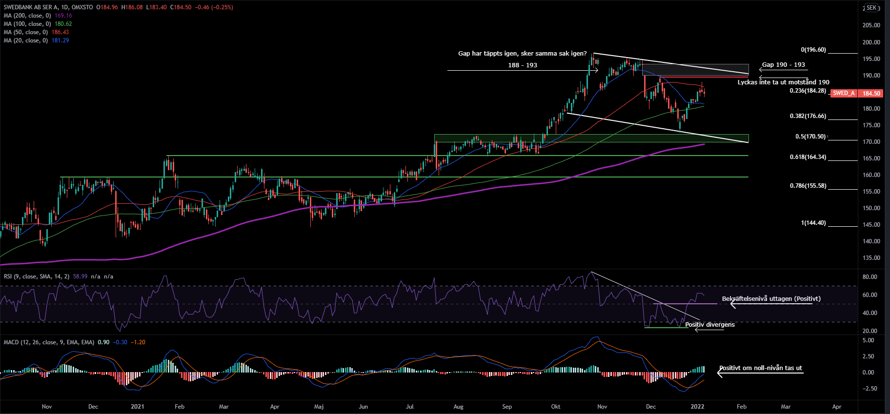 Swedbank har tillsammans med övriga banker presterat väldigt bra under det föregående börsåret. Uppgången är motiverad av diverse anledningar men rent makroekonomiskt så har den realiserade och förväntade inflationen utvecklats starkt och möjligtvis har marknaden börjat diskontera höjning av reporäntan som Riksbanken kommunicerat ska ske under våren 2023. SX3010PI är ett index som reflekterar utvecklingen av nio svenska banker och under 2021 slog indexet OMXGI (Stockholmsbörsen Inkl utdelningar). Med andra ord var 2021 ett starkt år för banker generellt efter att de laggat efter under 2021