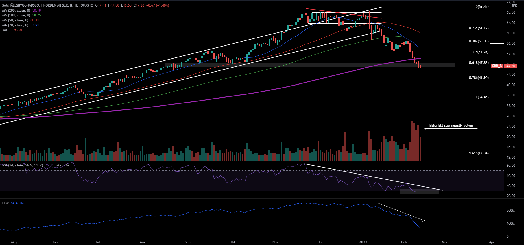 SBB har blivit en favorit hos många privata investerare under senaste två åren. Aktiens utvecklingen har varit väldigt stark och en längre uppåtgående trend formades under det föregående året. All time high sattes under slutet av november och efter det så började aktiekursen röra sig sidledes fram till och med andra veckan in i 2022. Köparna kunde inte försvara prisnivåerna kring den tidigare toppnoteringen, istället tog säljarna över och till slut bröt aktiekursen under den positiva trendens golv. Initialt bröt SBB under trendgolvet med tilltagande volym men studsade upp hastigt och letade sig in i den originella uppåtgående trenden. Volymen i uppgången var inte helt övertygande och istället bröt SBB ner återigen och denna gång med en stor säljvolym.