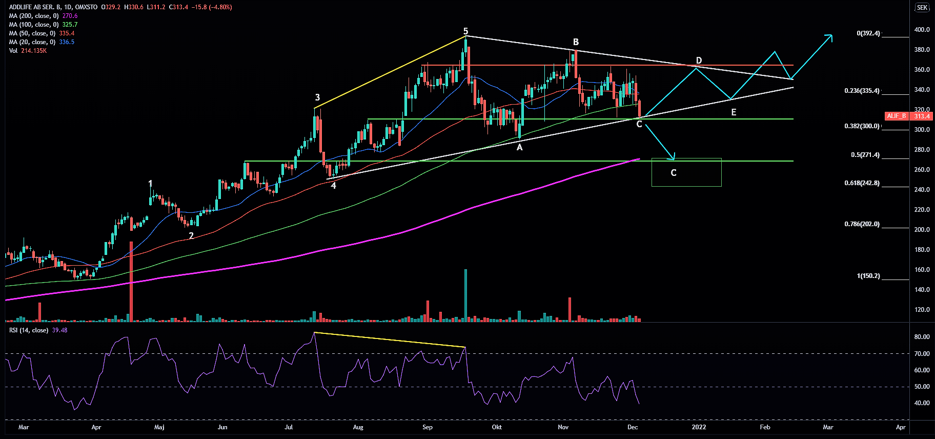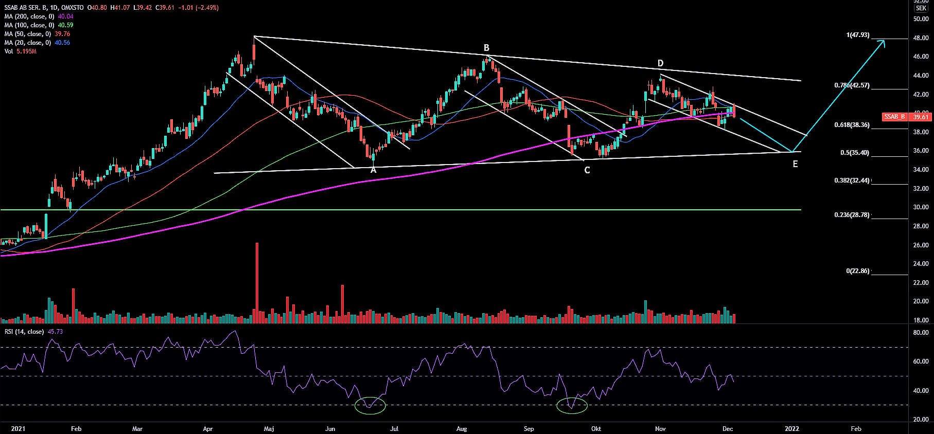 Addlife har presterat väldigt starkt under 2021 och bland Mid Cap bolagen är det den åttonde bästa aktien i år med en avkastning på över 117 %. Jag har valt att ta med Addlife i det här avsnittet eftersom kursgrafen i många hänseenden påminner om SSABs. Jag identifierar en ABCDE-korrektionsfas som jämfört med SSABs befinner sig i något tidigare läge. Jag tolkar grafen som att C-vågen slutfördes i fredags och nu ska D-vågen starta med target vid det fallande trendtaket. De ljusblåa linjerna ska man ta med en nypa salt och inte stirra sig blind på, men som jag nämnde tidigare fyller de ett syfte då de hjälper en att visualisera möjliga framtidsscenario.