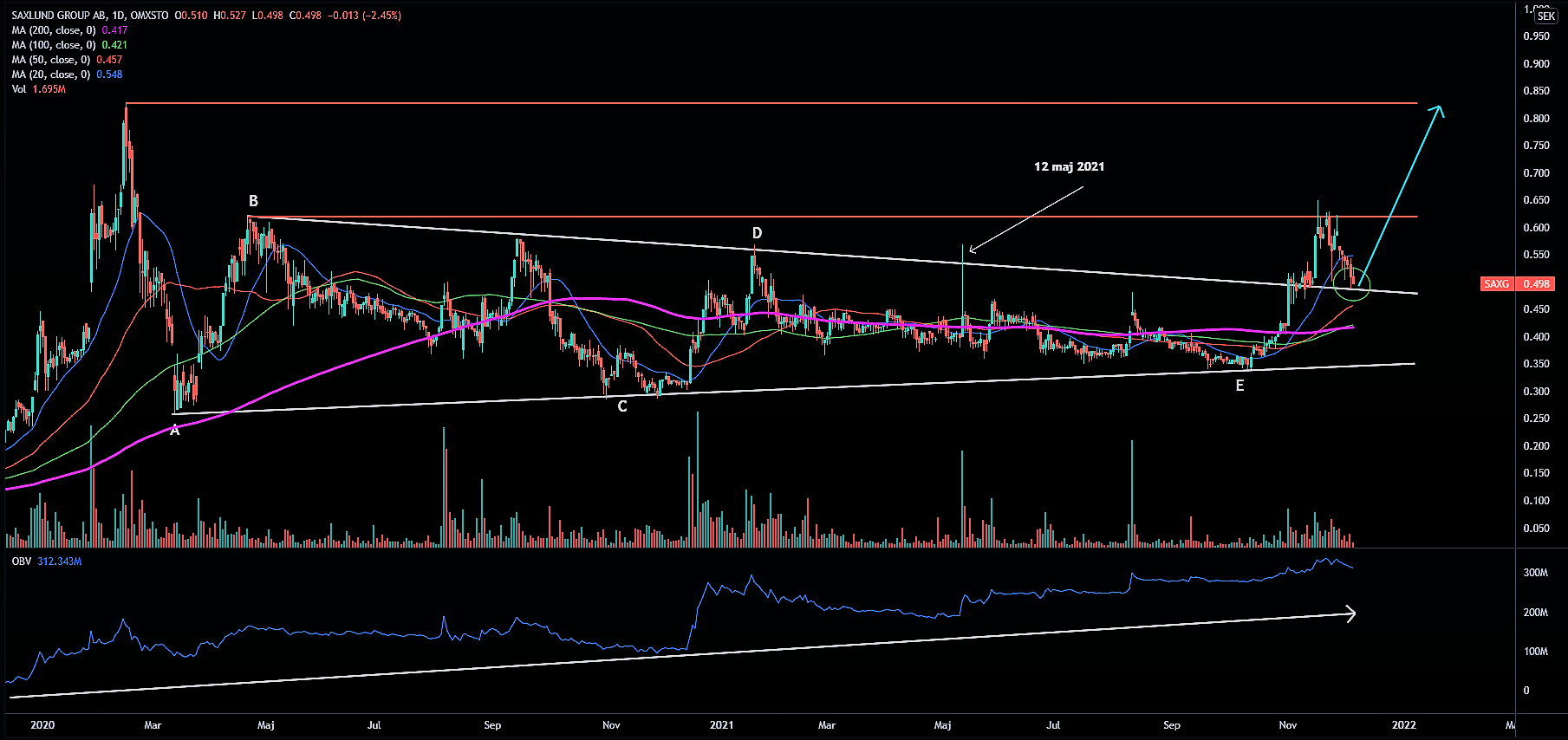 Saxlund har sedan Coronakraschen befunnit sig i en triangelformad konsolidering som karaktäriseras av högre bottnar och lägre toppar. Precis innan Coronan bröt ut i världen för första gången steg Saxlund makalösa 500-600 % beroende från vilken botten man utgår ifrån. Jag har valt att titta närmare på Saxlund av två anledningar