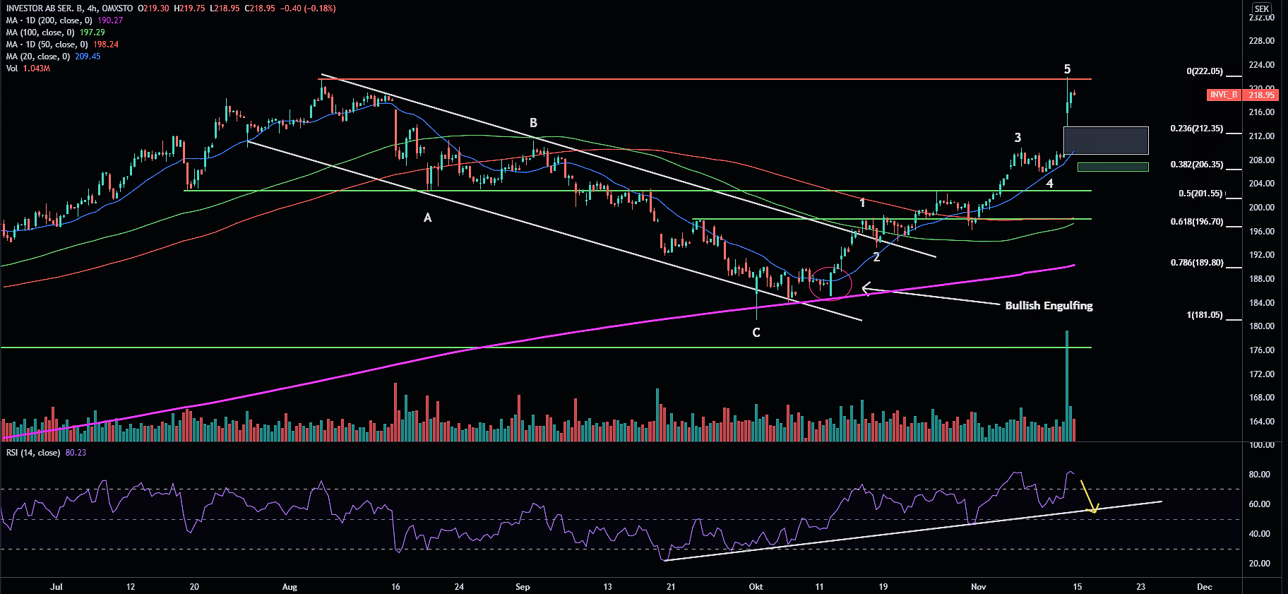 Investor har sedan mitten av oktober handlats upp till tidigare ATH-nivåer kring 220. Under fredagens förmiddag utmanades nivån och ett nytt marginellt ATH skapades (221,95), uppe på dessa nivåer stod säljarna redo och aktien lyckades inte hålla sig kvar utan handlades ned direkt efteråt. I och med fredagens öppning skapades ett gap, min tro är att aktien kommer svalas av initialt under veckan för att täppa till gapet. När gap uppstår skapas en obalans i handeln vilket relativt ofta resulterar i att säljare och köpare kommer överens om att täppa igen gapet. Sedan utbrottet har aktien stigit över 12 % och en mindre rekyl ner känns befogad, en potentiell dipp skulle jag se som hälsosam eftersom senaste kursuppgången varit väldigt snabb. En rimlig botten kan tänkas sättas vid fib 0,382 (gröna zonen), här skulle aktien kunna samla kraft för att testa ATH-nivån igen.