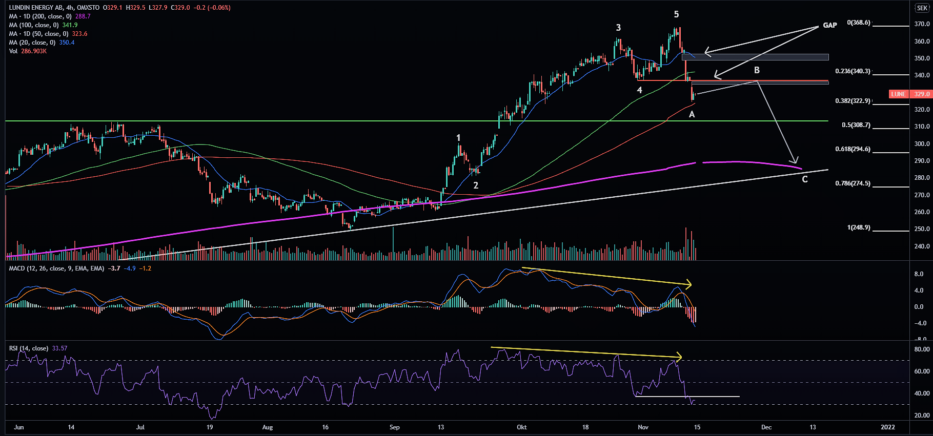 Om vi går över till den tekniska biten så är rekylen inte helt oväntad, speciellt när vi kikar närmare på vissa momentumindikatorer vilket vi kommer göra längre ner. I fyratimmarsgrafen kan en vågfrekvens på uppsidan ritas ut. Totalt fem vågor (12345) som enligt Elliotts vågteori ska följas upp av en rekylerande vågfrekvens (ABC). Jag tror att första vågen är avklarad i den rekylerande fasen och nu ska en korrektionsvåg genomföras (våg B) på uppsidan. Det som gör att jag tror botten i våg A är satt är huvudsakligen för att aktien har studsat fint på MA 100 i daily vilket även råkar vara runt fib 0,382, med andra ord en rimlig nivå för en temporär botten. Sedan tror jag att Lundin Energy kommer att rekylera mer enligt Elliotts vågteori och bottna kring trendgolvet vilket även kan komma att bli vart MA 200 (daily) glider (Se grafen för illustration). Detta är bara ett möjligt scenario som jag försöker illustrera, ett annat scenario är att de två gapen på uppsidan som skapats ska fyllas igen innan vidare nedgång. Det som kommer påverka kursutvecklingen i nära tid är åtalet som nyligen väckts men även prisutvecklingen för oljan.