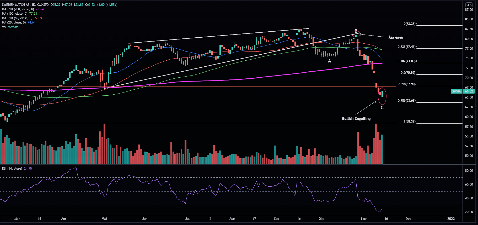 Värt att nämna är att Swedish Match fortsatt handlas i en positiv trend, dock har MA 200 brutits vilket gör att den positiva trenden hotas. Aktien har hittills inte format en lägre botten sett i ett längre perspektiv, exempelvis daily eller weekly. Om stödnivån runt 58,5 tas ut skulle jag säga att den positiva trenden är över och aktien börja gå in i en negativ trend. Just nu handlas Swedish Match en bra bit under diverse glidande medelvärden och jag tycker det rekylen ser något överdriven ut i nuläget. Min tro är därför att Swedish Match ska börja handlas upp mot samtliga glidande medelvärden, först gäller det att ta ut fib 0,618 (under den här veckan) vilket kan agera som ett starkt motstånd.
